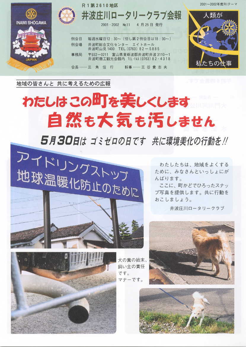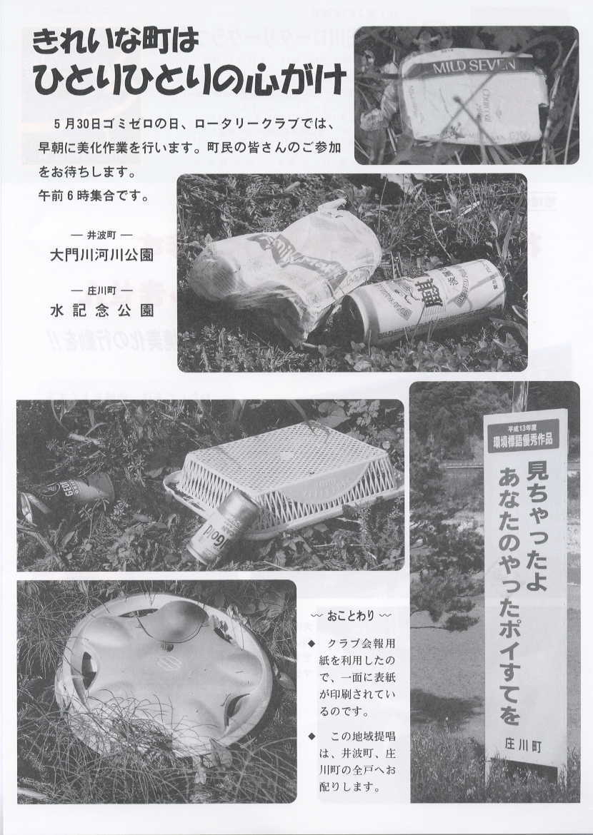 ところで、今年は、井波庄川ロータリークラブが、「ゴミゼロの日」特集の会報を発行し、啓発に井波町、庄川町両町に働きかけて全戸配布しました。杉森広報委員長の自慢の力作をご紹介します。
