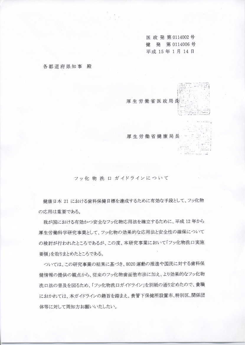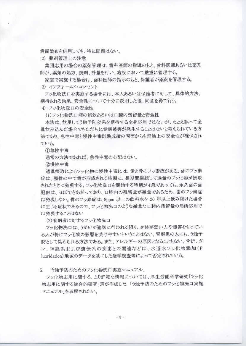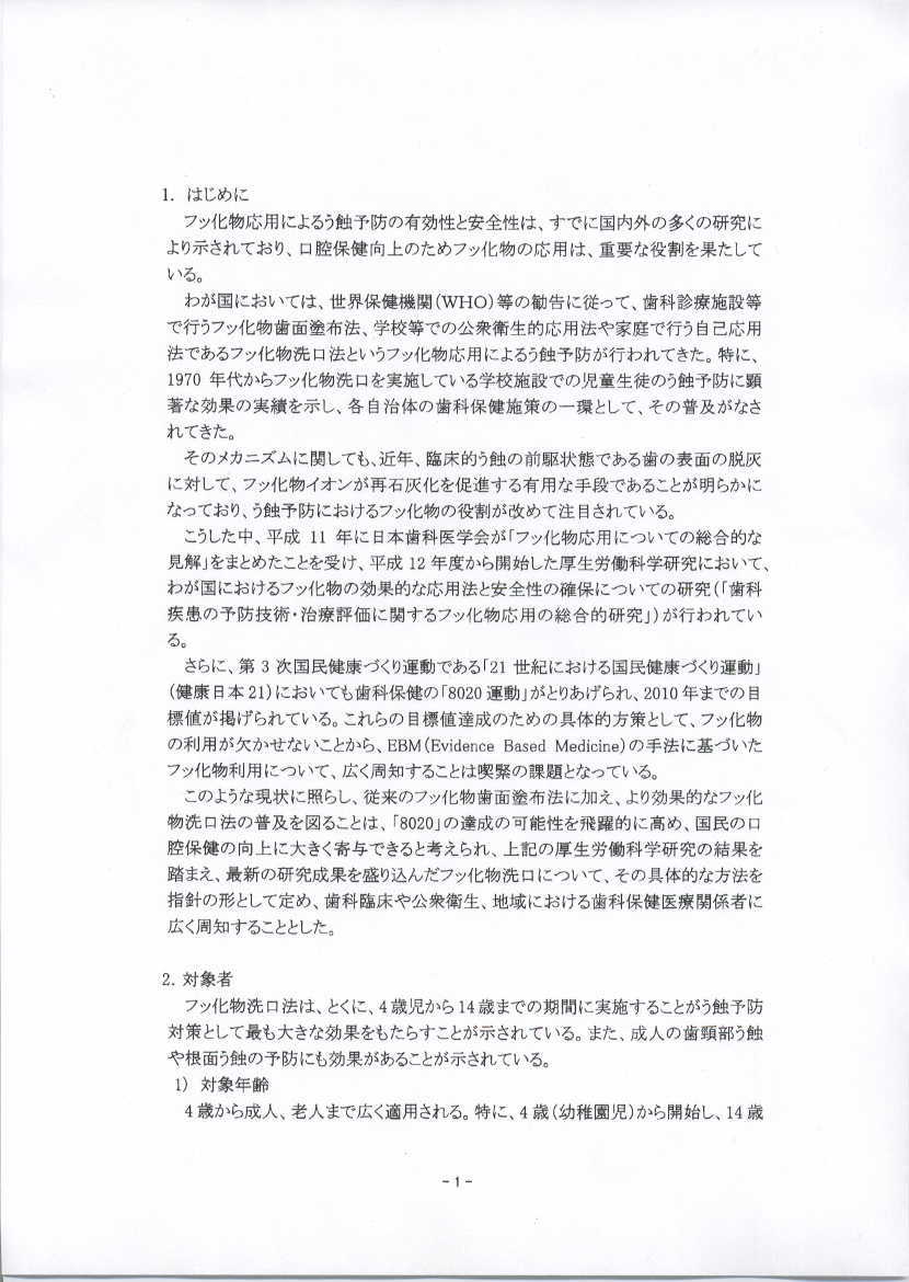 | 厚生労働省 「フッ化物洗口ガイドライン」 * 指針を提示 !! *文部科学省スポーツ・青少年局学校健康教育課から各都道府県教育委員会学校保健主管課へも送付;平成15年1月30日 医政発第0114002号 各都道府県知事 殿 厚生労働省医政局長 厚生労働省健康局長 フッ化物洗口ガイドラインについて 健康日本21における歯科保健目標を達成するために有効な手段として、 フッ化物の応用は重要である。 我が国における有効かつ安全なフッ化物応用法を確立するために、 平成12年から厚生労働科学研究事業として、 フッ化物の効果的な応用法と安全性の確保についての検討が行われたところであるが、 この度、 本研究事業において 「フッ化物洗口実施要領」 を取りまとめたところである。 ついては、 この研究事業の結果に基づき、 8020運動の推進や国民に対する歯科保健情報の提供の観点から、 従来のフッ化物歯面塗布法に加え、 より効果的なフッ化物洗口法の普及を図るため、 「フッ化物洗口ガイドライン」 を別紙の通り定めたので、 貴職におかれては、 本ガイドラインの趣旨を踏まえ、 貴管下保健所設置市、 特別区、 関係団体等に対して周知方お願いいたしたい。 1. はじめに フッ化物応用によるう蝕予防の有効性と安全性は、 すでに国内外の多くの研究により示されており、 口腔保健向上のためフッ化物の応用は、 重要な役割を果たしている。 わが国においては、 世界保健機関 (WHO) 等の勧告に従って、 歯科診療施設等で行うフッ化物歯面塗布法、 学校等での公衆衛生的応用法や家庭で行う自己応用法であるフッ化物洗口法というフッ化物応用によるう蝕予防が行われてきた。 特に、 1970年代からフッ化物洗口を実施している学校施設での児童生徒のう蝕予防に顕著な効果の実績を示し、 各自治体の歯科保健施策の一環として、 その普及がなされてきた。 そのメカニズムに関しても、 近年、 臨床的う蝕の前駆状態である歯の表面の脱灰に対して、 フッ化物イオンが再石灰化を促進する有用な手段であることが明らかになっており、 う蝕予防におけるフッ化物の役割が改めて注目されている。 こうした中、 平成11年に日本歯科医学会が 「フッ化物応用についての総合的な見解」 をまとめたことを受け、 平成12年度から開始した厚生労働科学研究において、 わが国におけるフッ化物の効果的な応用法と安全性の確保についての研究 (「歯科疾患の予防技術・治療評価に関するフッ化物応用の総合的研究」) が行われている。 さらに、 第3次国民健康づくり運動である 「21世紀における国民健康づくり運動」 (健康日本21) においても歯科保健の 「8020運動」 がとりあげられ、 2010年までの目標値が掲げられている。 これらの目標値達成のための具体的方策として、 フッ化物の利用が欠かせないことから、 EBM (Evidence Based Medicine) の手法に基づいたフッ化物利用について、 広く周知することは喫緊の課題となっている。 このような現状に照らし、 従来のフッ化物歯面塗布法に加え、 より効果的なフッ化物洗口法の普及を図ることは、 「8020」 の達成の可能性を飛躍的に高め、 国民の口腔保健の向上に大きく寄与できると考えられ、 上記の厚生労働科学研究の結果を踏まえ、 最新の研究成果を盛り込んだフッ化物洗口について、 その具体的な方法を指針の形として定め、 歯科臨床や公衆衛生、 地域における歯科保健医療関係者に広く周知することとした。 2. 対象者 フッ化物洗口法は、 とくに、 4歳児から14歳までの期間に実施することがう蝕予防対策として最も大きな効果をもたらすことが示されている。 また、 成人の歯頸部う蝕や根面う蝕の予防にも効果があることが示されている。 1) 対象年齢 4歳から成人、 老人まで広く適用される。 特に、 4歳 (幼稚園児) から開始し、 14歳 (中学生) まで継続することが望ましい。 その後の年齢においてもフッ化物は生涯にわたって歯に作用させることが効果的である。 2) う蝕の発生リスクの高い児 (者) への対応 修復処置した歯のう蝕再発防止や歯列矯正装置装着児の口腔衛生管理など、 う蝕の発生リスクの高まった人への利用も効果的である。 3. フッ化物洗口の実施方法 フッ化物洗口法は、 自らでケアするという点では自己応用法 (セルフ・ケア) であるが、 その高いう蝕予防効果や安全性、 さらに高い費用便益率 (Cost-Benefit Ratio) 等、 優れた公衆衛生的特性を示している。 特に、 地域単位で保育所・幼稚園や小・中学校で集団応用された場合は、 公衆衛生特性の高い方法である。 なお、 集団応用の利点として、 保健活動支援プログラムの一環として行うことで長期実施が確保される。 1) 器材の準備、 洗口剤の調製 施設での集団応用では、 学校歯科医等の指導のもと、 効果と安全性を確保して実施されなければならない。 家庭において実施する場合は、 かかりつけ歯科医の指導・処方を受けた後、 薬局にて洗口剤の交付を受け、 用法・用量に従い洗口を行う。 2) 洗口練習 