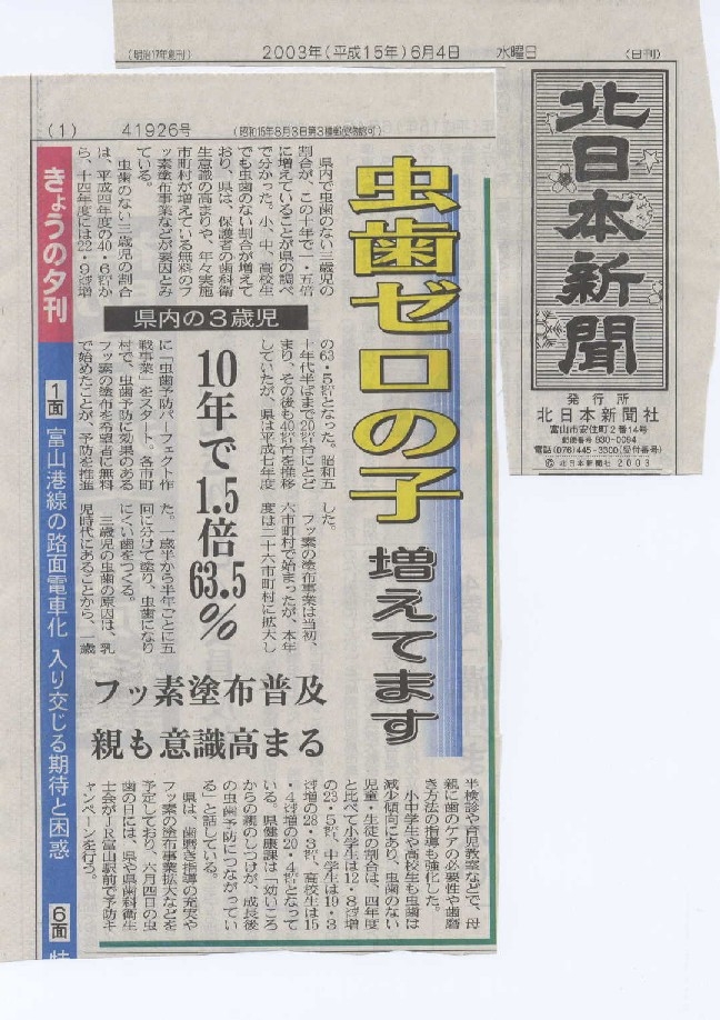 本日の北日本新聞1面に、「虫歯ゼロの子 増えてます」の記事!
