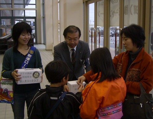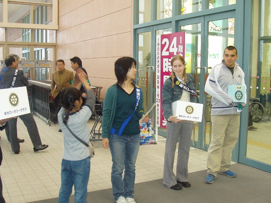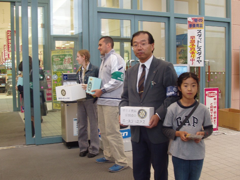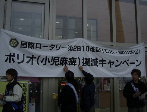 各ロータリークラブから3名と、インターアクト、ローターアクトのクラブ員、交換学生の総勢20数名が「ポリオ(小児麻痺)撲滅キャンペーン」の訴えをチラシの配布ならびに街頭募金という形で活動しました。井波庄川ロータリークラブからは、斉藤彰幹事、河合耕一会員、山本武夫会員(家族連れ)が参加しました。