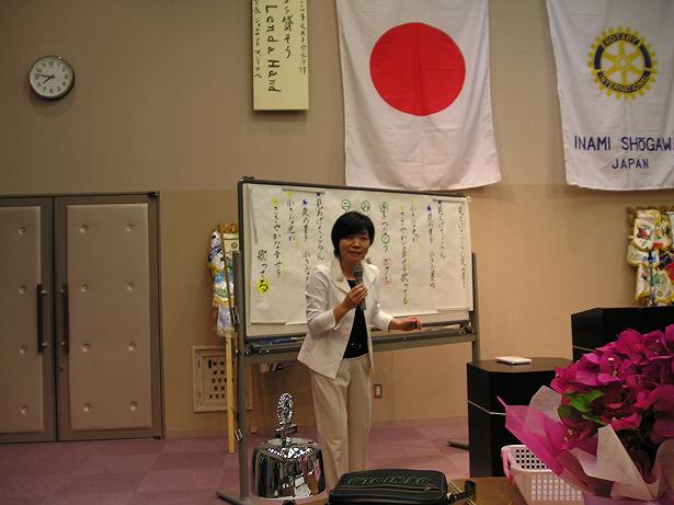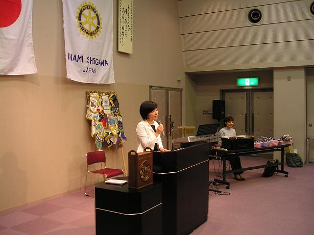 | 卓話ゲスト:丹保博美氏(日本音楽療法学会認定 音楽療法士)・・・・紹介者(小生:山本武夫) 丹保さんは、富山県音楽療法協会理事で、精神科や老健施設・特養などで定期的音楽療法を担当され、又、地域福祉として知的障害者や在宅障害者などにも音楽療法を行っておられる。又、富山市医師会看護専門学校の講師もされ、公立井波総合病院糖尿病患者会などの講師もされている。 ご主人の丹保運送社長、丹保(旧姓太田)正敏さんは、高岡万葉ロータリークラブ会員で、以前井波庄川ロータリークラブへ、米山奨学生をお連れいただいた。もともと、井波町出身で、たまたま小生の中学時代の野球部1年後輩。彼は、高岡商業時代、有名な伊東与二元監督さん(昨年まで長女がマネージャーをしていた砺波高校野球部監督)と同期で、甲子園に出場している。伊東先生と話したときにも、丹保さんの話題が出た。 今回の卓話も、井波庄川ロータリークラブに丹保正敏さんが来られたときに、奥様の音楽の話をお聞きし、お忙しいスケジュールを確認し、何度かお願いしてようやく今回実現したものである。 また、今回は2610地区北川ガバナーの方針の「各クラブに家族委員会を立ち上げよう」という趣旨に沿った第1回の家族例会である。会員の家族、パスト会員あるいは遺族など、過去に関係のある方を呼んで一緒に例会を楽しもうという企画である。 ちょうど,ロータリアンの奥様である丹保さんには、十分すぎるほどその辺の気配りをしていただいた。 随所にロータリーに関する話題を盛り込んでいただいて、大変素晴らしい卓話になったと紹介者としては満足している。 |