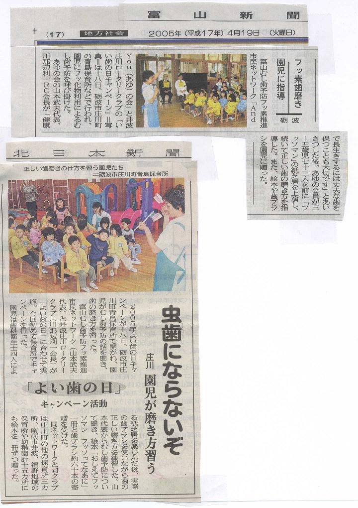| 4月18日(良い歯の日)、And You (あゆ) の会と井波庄川ロータリークラブの共催でキャンペーンを行いました。