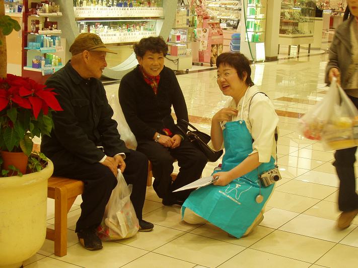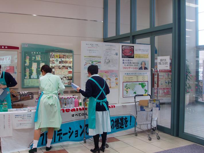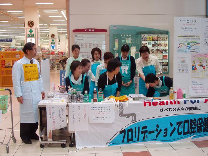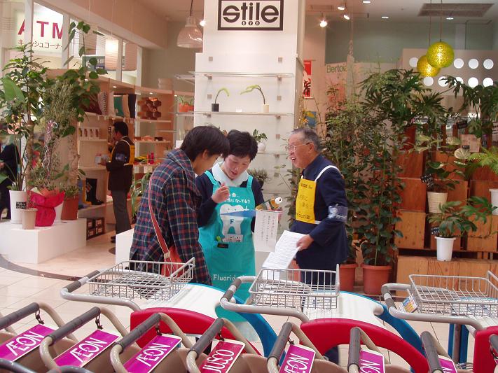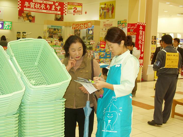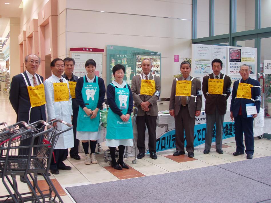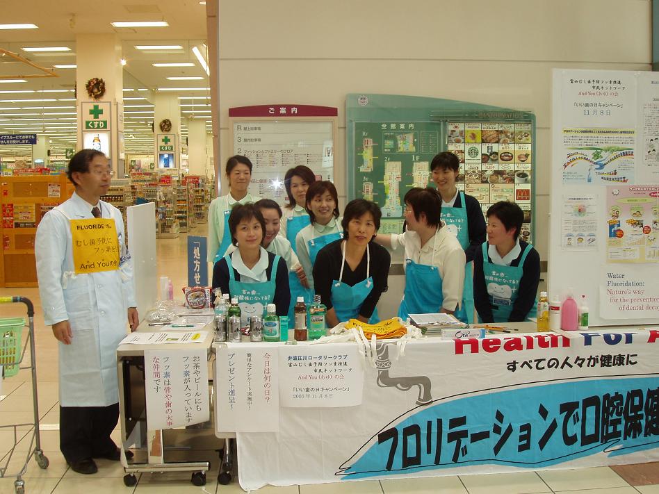 活動内容は、「今日は何の日ですか」と呼びかけ、簡単なアンケート(聞き取り)を行い、むし歯予防にフッ化物利用をとチラシなどを配布し、プレゼント(協賛の各社からの物とお茶・F濃度のいいミネラルウォーター)を提供するものです。