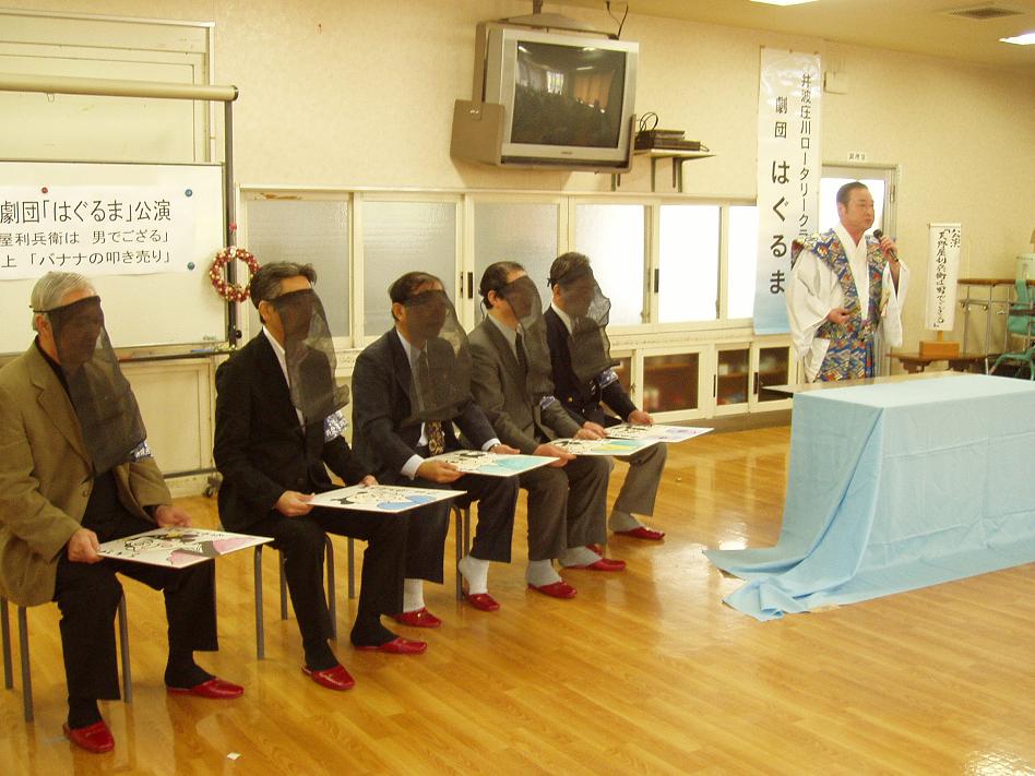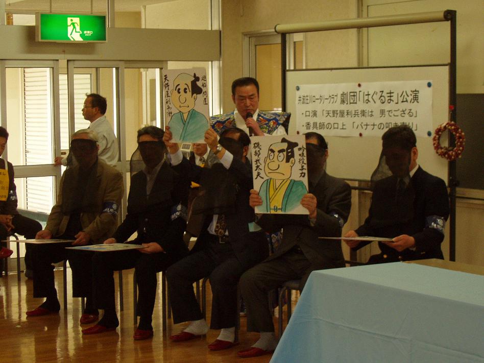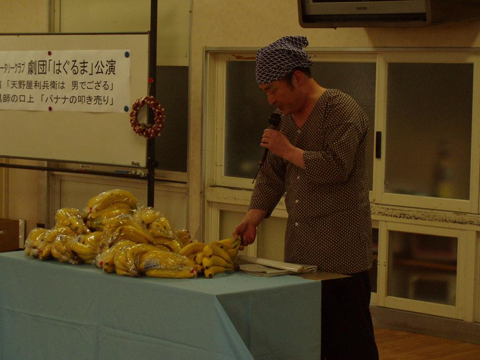 続いて、井波庄川ロータリークラブ、劇団「はぐるま」の公演があり、まずは、口演 忠臣蔵外伝「天野屋利兵衛は男でござる」を、その次は、香具師の口上「バナナの叩き売り」を、小西座長がほとんど一人で、演じられました。