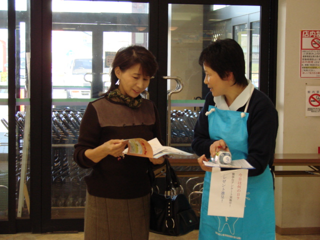 「いい歯の日(11月8日)」のキャンペーンが8日、南砺市寺家新屋敷(福野)ショッピングセンター「ア・ミュー」で、開かれ、富山むし歯予防フッ素推進市民ネットワーク「And You (あゆ) の会」(山本武夫代表)が買い物客にチラシを配った。