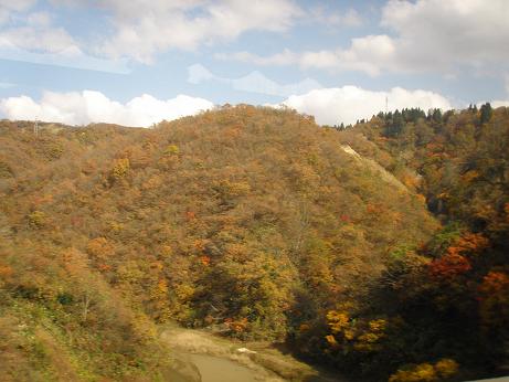 ![]() 途中の山々の紅葉・・・山肌に地震の爪あとが残っていました |