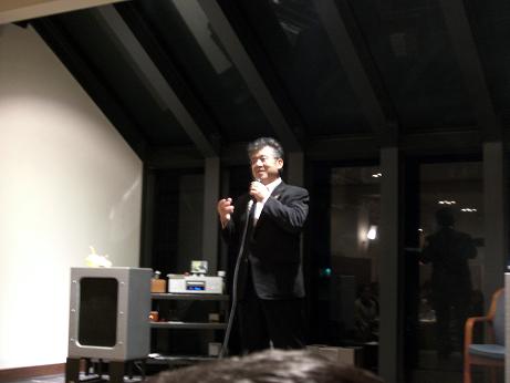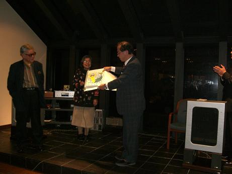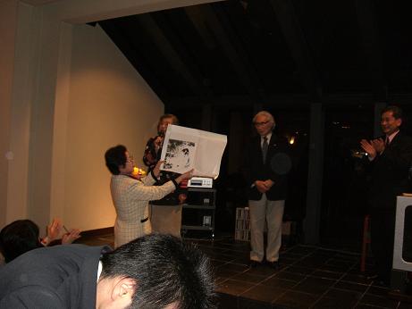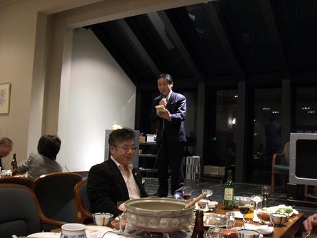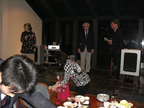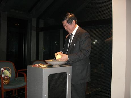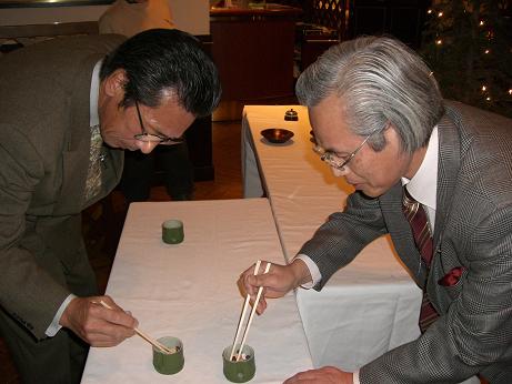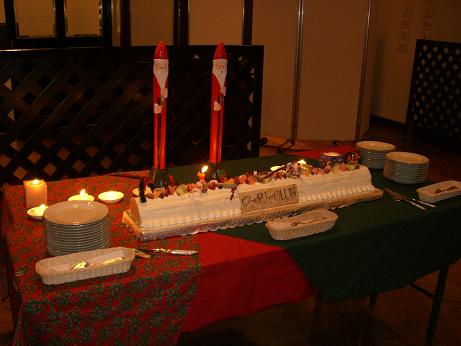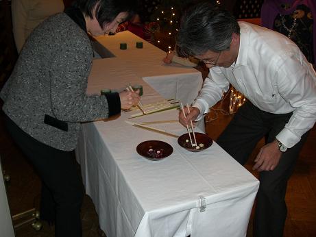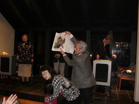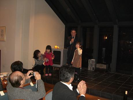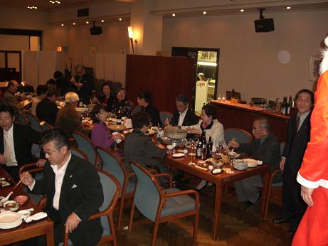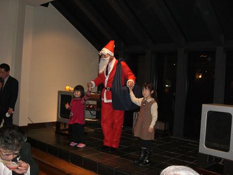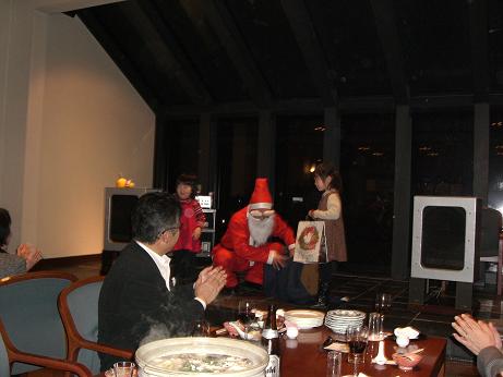 | 今年のクリスマス家族例会は、福野ニチマホテルで開催されました。福嶋親睦委員長の世話で、木村英典会員や横川正希会員のお孫さんが参加され、雰囲気が和むアットホームな会になりました。三角会長自らがサンタクロース【自称:三角ロース】に扮しての子供さんへのプレゼント贈呈があり、余興のゲーム、@りんごの皮むき競争や、A各種箸での豆運び競争に、真剣に取り組む会員の姿が、会場を楽しくしました。また、クリスマス・プレゼントは、斉藤清策会員や横山豊介会員の色紙で、抽選で3名にご本人からの贈呈となりました。SAAの高瀬顕正会員も、この日は、いつもより文章の長いニコBOXの紹介に、汗だくでした。終盤は、我がクラブの3名のエンタテーナー、斉藤彰会員の「ホワイト・クリスマス」、小西勝会員の「浪花節」風の語りと演歌、トリは三角信行会長自らの「麦屋節」で、最高潮に達し、最後は、ロータリーソング「手に手つないで」で、締めくくりとなりました。 |