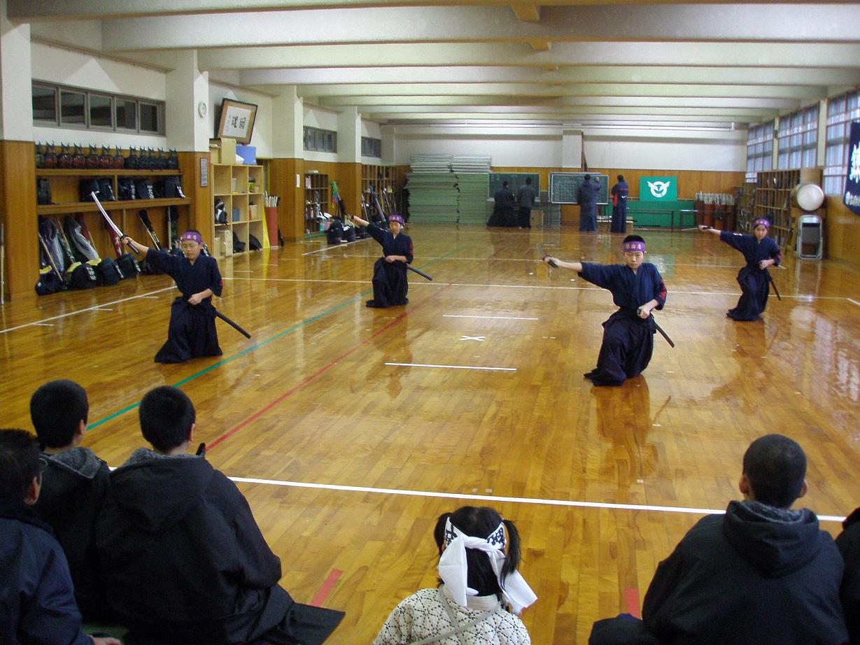 小学6年の篠原天馬、松田尚之、山本麻紗子、山田千菜都の居合型の披露