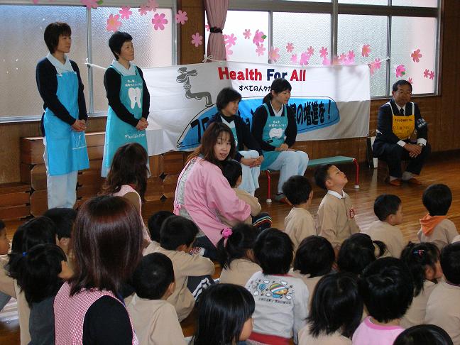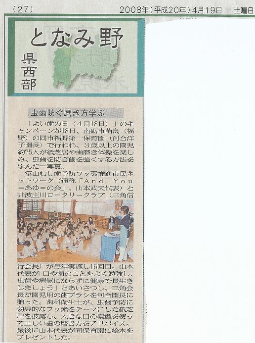 健康はみんなの願いです。4月18日(良い歯の日)に、県民が丈夫な歯や歯肉で何でも食べられるよう、お口や歯の健康づくりを呼びかけ、全身の健康の保持増進に寄与することを目的とします。国や日本歯科医師会は8020運動を進めており、「健康日本21」で国民の目標を挙げています。それらすべての出発点は歯を健康に保つ,つまり,むし歯にならないように予防をしっかりすることです。富山むし歯予防フッ素推進市民ネットワーク【And You (あゆ) の会】は、県民や国民全体がフッ化物の正しい知識を持ち,優れた方法で健康である政策が進められるよう努力し、井波庄川ロータリークラブは、地域における社会奉仕活動の一環として、施設等の社会支援のため、この事業に協力いたします。是非,私達のこの活動をご理解頂き、諸外国では常識となっているむし歯は過去の病気である世界を実現するために,ご協力をお願いいたします。