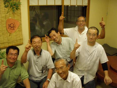 中島良夫先生を囲んで「WE ARE THE NO.1」福野高校甲子園出場を祝して・・・松井、下田、板橋、林(新木)、加藤(長原)、清瀬(じゅうじゅう店主)、後列は、山本、得永