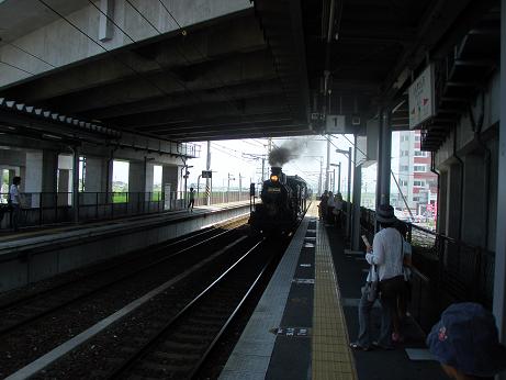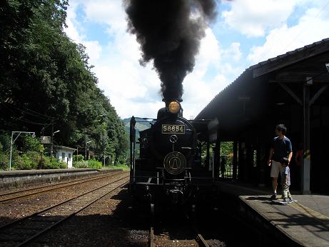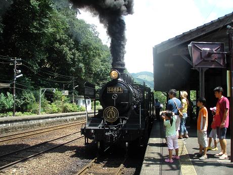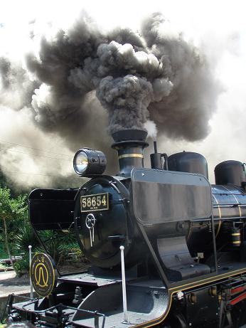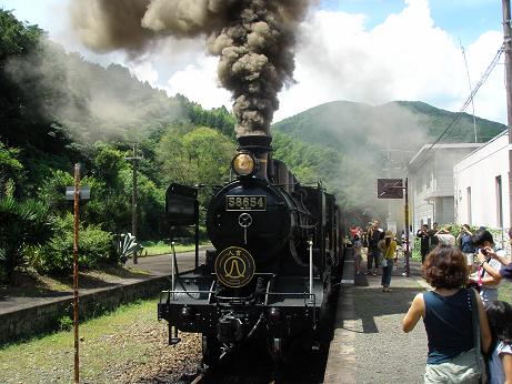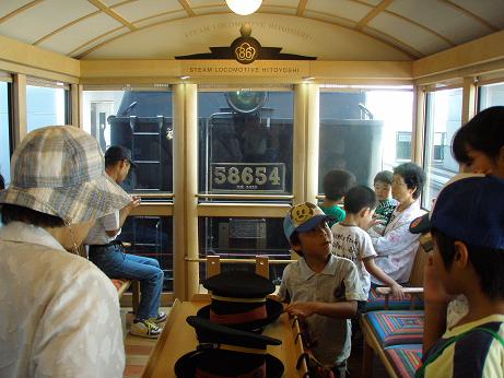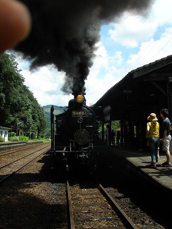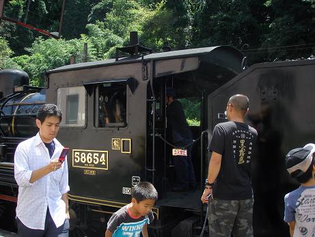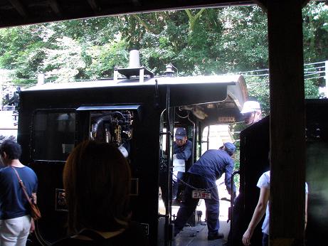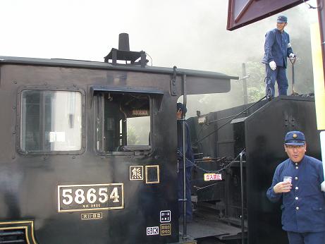 ![]() 昔ながらの、石炭をくべる乗務員さんたち。この日は35度くらいの真夏日 水分補給しないと熱射病になります。 |