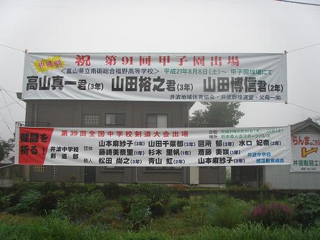 ![]() 坪野交差点の、大会前の横断幕・・・井波中育成会。 |