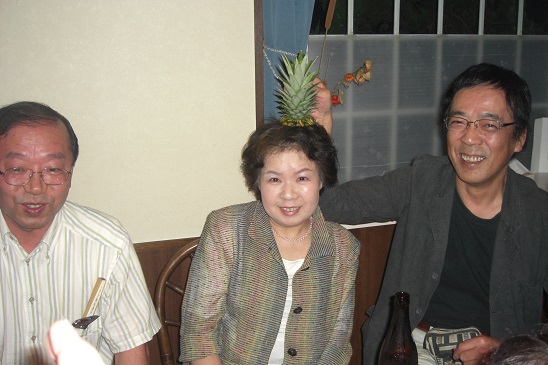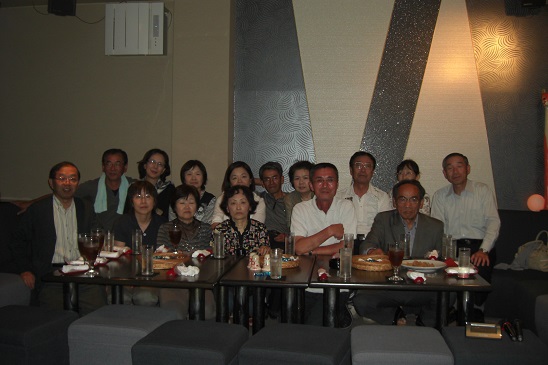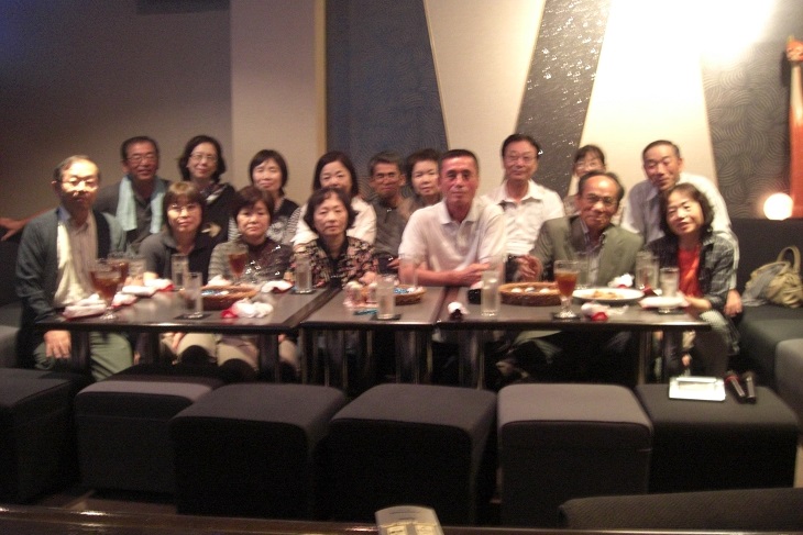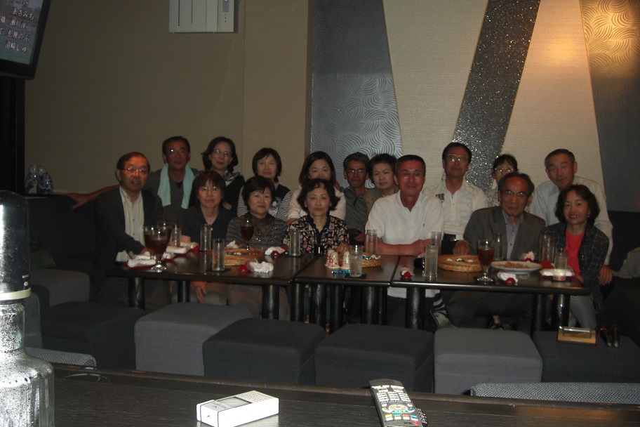 | (上記写真:2次会「華祥」にて) 後列:太田、小林(須河)、山田(堀井)、中田、藤永、(北田)、山本(野原)博、高田、長谷川 前列:山本武、高木(岩倉)、窪島、藤村(木村)、長田、寺西、中村(長原) このほかに、1次会「セントポーリア」に、鴨野、大久保、長谷川清、本江(光主)、三箇(野村)が参加。総勢21名。 |