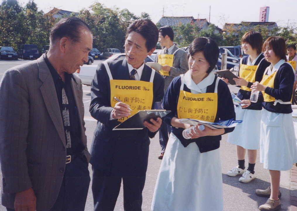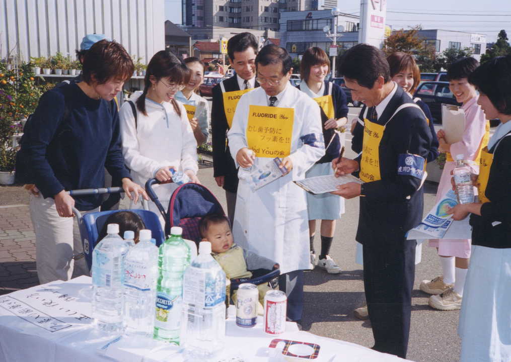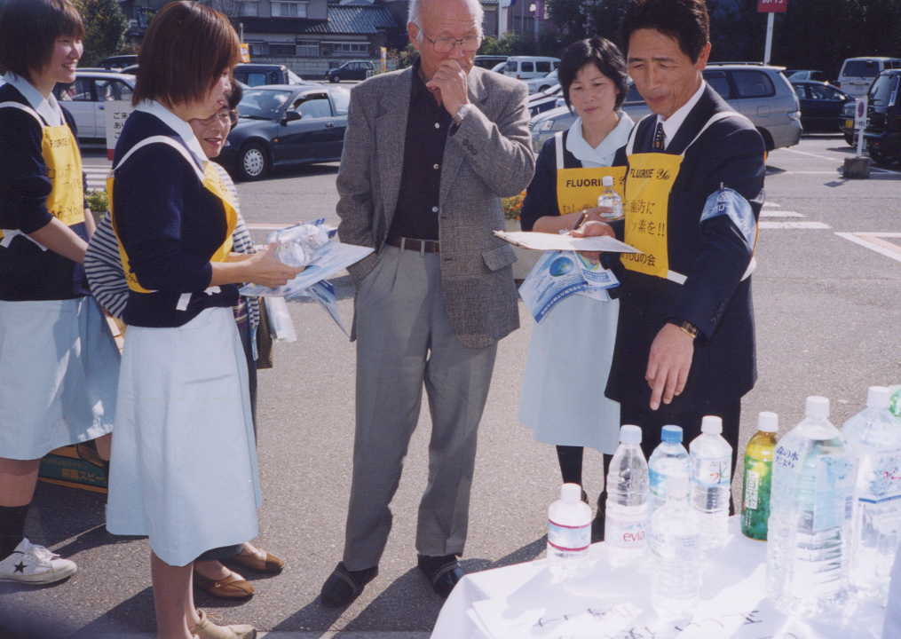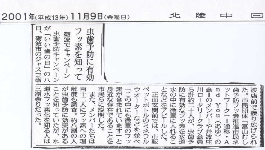 | 北陸中日新聞 11月9日 『虫歯予防に有効 フッ素を知って 砺波でキャンペーン』 虫歯予防キャンペーンが「いい歯の日」の8日、砺波市のジャスコ砺波店前で繰り広げられた。市民団体「富山むし歯予防フッ素推進市民ネットワーク」=通称・And You(あゆ)の会=のメンバーや井波庄川ロータリークラブ会員ら約20人が、虫歯予防に有効なフッ素を水道水の中に微量に入れることなどをアピールした。 正面玄関前では、市販ペットボトルのミネラルウォーターなどを並べ「これにも微量のフッ素が含まれています」と身近な存在であることを市民らに説明した。 また、メンバーたちは112人にフッ素への理解度も調査.約八割の人が虫歯予防に効果があることを知っていたが、水道水フッ素化を知る人は三割余りだった。 |