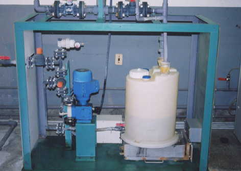 慶州上水道管理事務所の李相儉担当官の説明を、KIWON社の姜永赴Z術顧問が通訳され、浄水場の視察をしました。慶州では、液状フッ素投入方式を採用しており、最近は韓国ではこちらが費用の面でも安いので増えているそうです。材料は、液体のフッ化珪素酸(水に無限に溶解)を用いますが、精製工場から40%の濃度のものが運ばれ、浄水場の屋上にある2基のタンクに貯蔵されます。そこから、階下にある添加装置で浄化された水の流水量に併せて、一定量が添加されます。