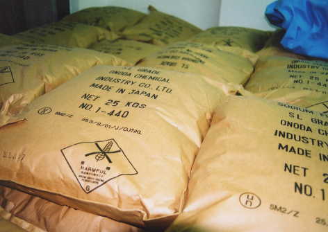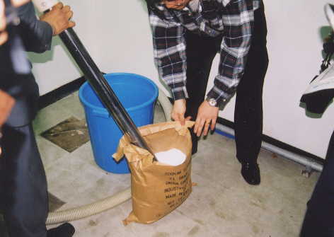 フッ化ナトリウムは、日本の大阪の小野田化学という会社から輸入していました。粉末フッ素(125kg)の投入は12袋半使用しますが、適宜職員が袋を開封し、バキューム装置で吸引し、添加装置まで輸送します。添加装置には砂時計形式で一定量が投入され、攪拌溶解され、4%のフッ化ナトリウムの飽和溶液が作られます。その飽和溶液を浄水処理された水に流水量に応じて一定量が注入されます。その注入されて浄水池に入った状態でモニタリングがなされ、浄水中のフッ素濃度が計測されています。鎮海のフッ素濃度は0.8ppm±0.1ppmにコントロールされています(ちなみに韓国の飲料水フッ素イオン濃度許容範囲の上限は1.5ppmです)