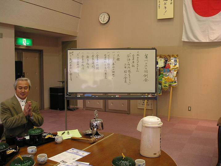 ・幹事報告 小西幹事「@はぐるま、第1回稽古会実施。斉藤座員、都合悪く山本座員に変更。A本日、例会終了後、緊急理事会開催。」