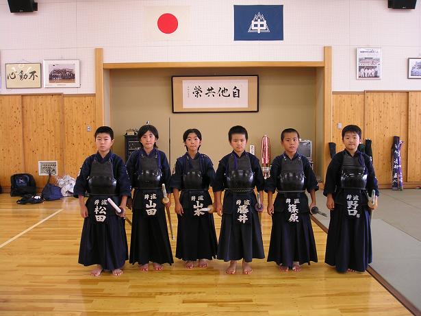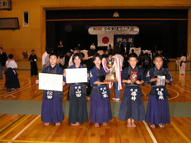 優勝直後、全員でクールダウンを兼ねて雄山中学校の武道場へ、補欠の野口勝弘君も一緒に記念撮影!