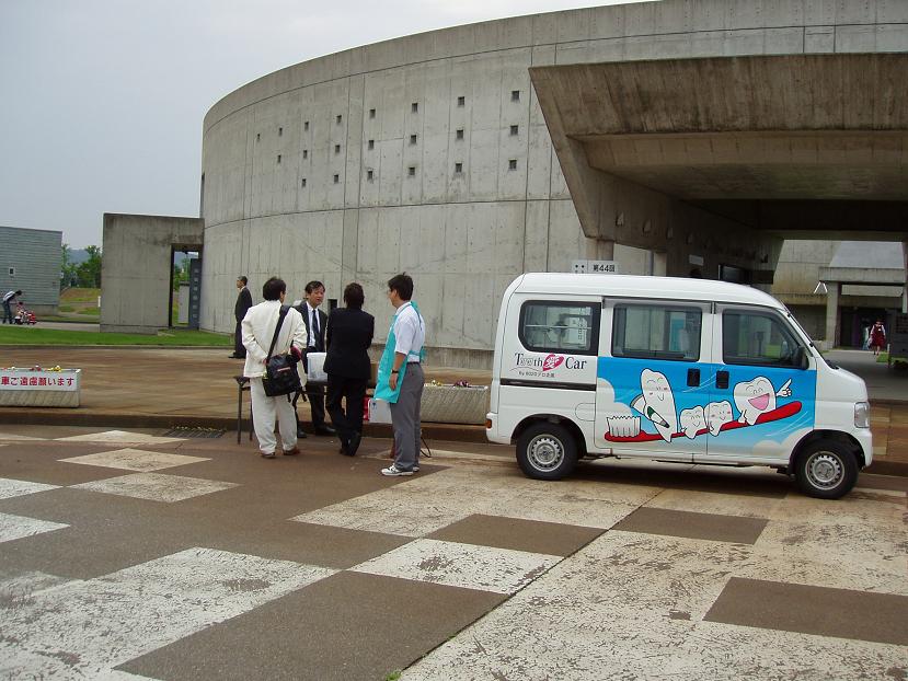 また、八木先生を囲んで昼食会のあと、2時から40分ほど、講演会場隣にある、イベント広場、クロスランドタワー、ダビンチミュージアムの施設をもつ「クロスランドおやべ」で、親子連れにフッ化物配合歯磨剤のサンプルやチラシ、歯科衛生士会提供の歯科保健ハンドブックなどの小冊子を配布しました。