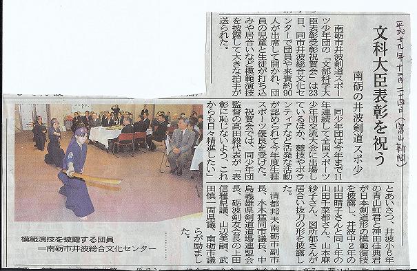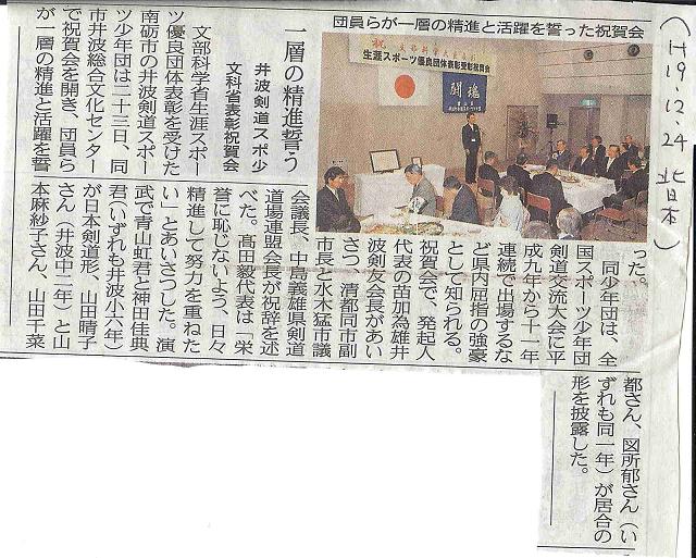 | 12月23日、当日を迎えました。朝から、演武のリハーサルも行い、スライドのチェックなどして、午後を迎えました。井波剣道スポ少の関係者がほぼ全員集まる中で、大臣表彰の祝賀会が開催されました。過去に活躍したOBの子供たちは、大学や高校で、合宿などの最中、また、中学生男子6名も兵庫県への遠征で欠席し、少し残念でした。 式直前に届いた、OGの永森綾さんからのメッセージと花束は、この祝賀会1のサプライズでした。今までのお礼と、帰って剣道で後輩たちの指導をしたいというメッセージは、関係者一同ほろりとさせられました。 また、会場にとどいたスタンドフラワーは、まだ結成されていない「井波剣道スポ少父母の会OBの会」からで、将来には、父母の会ともどもスポ少を支える意味で嬉しい贈り物です。 長い間、裏方として、連夜遅くまで準備にあたられた山田修弘さんはじめ、準備委員会発足以来、皆さんの協力のお蔭で、無事式典や懇親会が終えられ、ほっとしています。 最後に山辺県議の挨拶の「素晴らしい手作りの祝賀会でした。」とありましたが、まさにその通りの会でした。 県外にいる、OBや関係者に報告する意味でも、このページに、出来るだけ詳しく掲載したいと思います。(山本武夫:父母の会) |