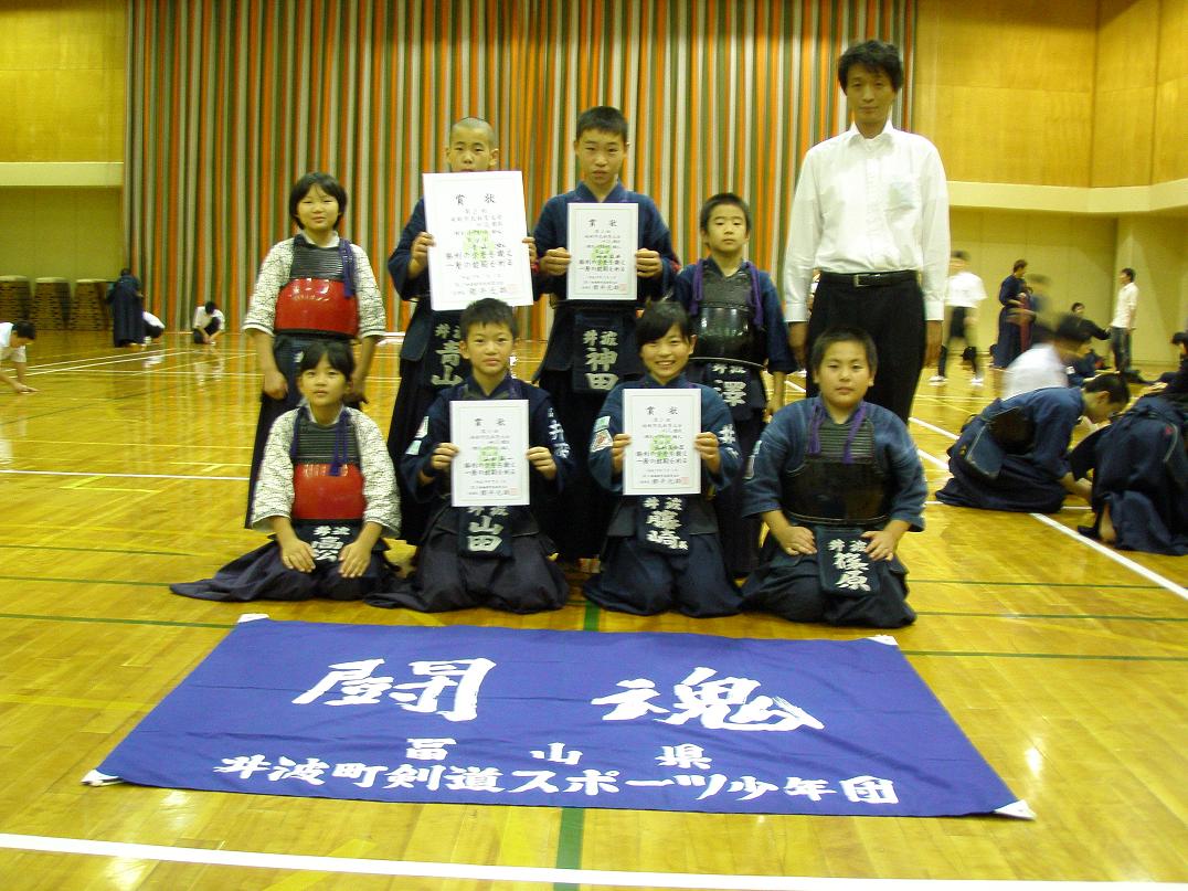 地元の大会ということもあり、昨日ほどの緊張もなく、皆ほぼ順調に勝ち進み、井波勢が、7クラス中、中学女子個人と一般団体を除く5クラスで優勝しました。中学生女子は新チームになって、春から3回目の対戦で、初めて福野中に勝ち、嬉しい新年度初優勝で、この大会は3連覇。中学男子は順当勝ち。小学生個人は、準決勝に全員、井波が進出、決勝は6年生同士、押し気味に進めた神田君でしたが、延長に入り、一瞬の隙を小手で青山虹君が優勝。5年生藤崎、4年生の5人も元気に試合を進め、普段の練習の成果を感じました。中学生女子は、準決勝までに1−2年生が3人残り、山田晴子選手は、優勝した川合選手(福野)に惜しくも破れましたが、確実な成長の跡を示しました。同級生対決となった、山本麻紗子・山田千菜都戦は、両者相譲らず、互角の進行でしたが、延長に入って数分後、一瞬の隙をついた山本選手の小手が微妙な判定ながら決まり、山田選手はここで残念ながら敗退。決勝は、延長の余韻を引きづったか、動きの鈍い山本選手に対し、福野の川合選手が連続して、面、小手を決め、3年生の面目を躍如しました。中学生男子は、準々決勝で、先の地区戦決勝の再現となった青山空選手に雪辱した中村法貴選手が、その後は順当勝ち、決勝でも、反対ブロックを勝ち進んだ2年生の後輩洲崎選手を寄せ付けず優勝。一般男子は、団体では初戦でまだ油が回らず、優勝した福光チームに敗退しましたが、個人戦に入って井波勢は俄然好調。全員初戦を勝ちあがり、決勝は、準決勝で井波対決を制した辻村選手と、1試合ごとに調子を上げた斉藤選手の戦いで、井波の子供たちにとっては普段指導をしてくださる先生同士の見ごたえある試合を観戦できるいいチャンスとなりました。試合は、開始早々、引き胴を決めた斉藤選手に対し、中盤一瞬の引き小手が辻村選手に出て、最後の1本勝負になりました。終了間際に、斉藤選手が小手を押さえて、優勝、子供たちの前で、いい手本を見せてもらいました。(山本武夫:評)