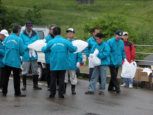 ![]() 各自、可燃用と不燃用のごみ袋、勝星産業提供の軍手を配布。 |