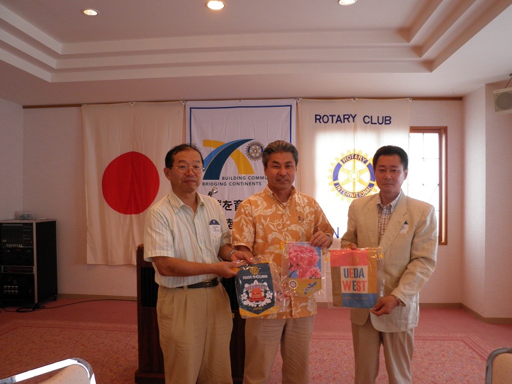 先に、上田西RCの下形さんと名護RCの具志堅会長のバナー交換 |