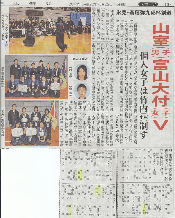 団体 男子 井波・福野合同チーム 予選リーグ敗退 女子 井波・出町合同チーム 予選リーグ1位で、決勝トーナメント進出するも、1回戦で敗退、ベスト8 個人 男子 青山虹 ベスト8 女子 藤崎美奈里 3位入賞