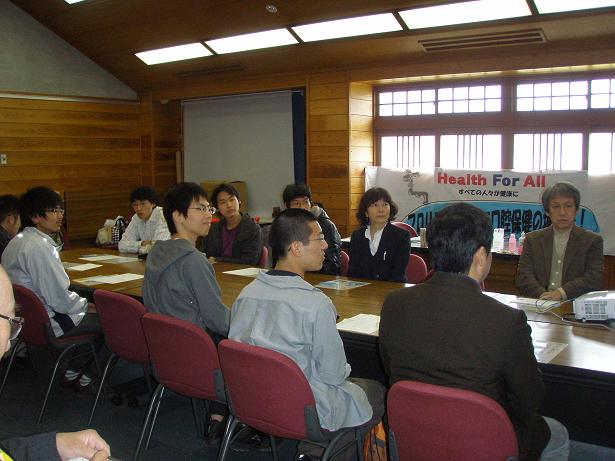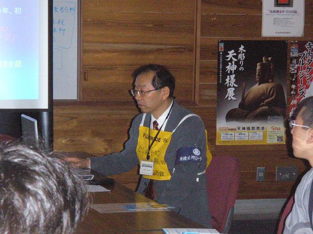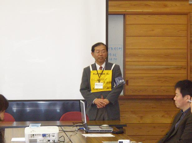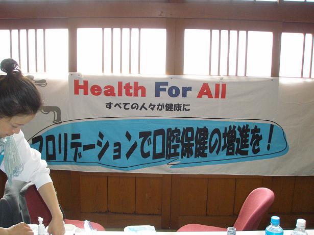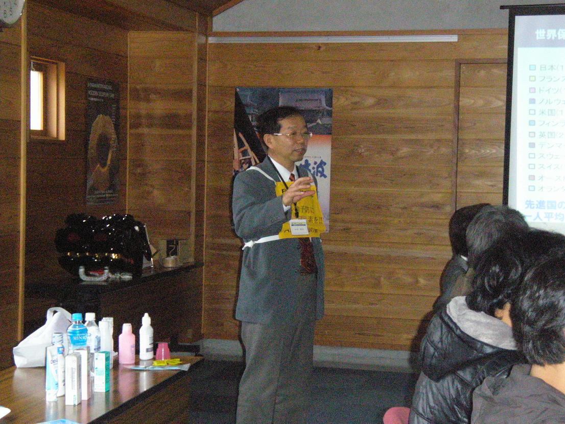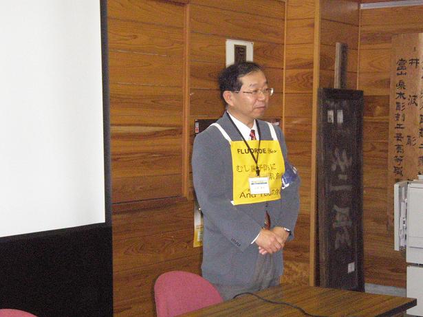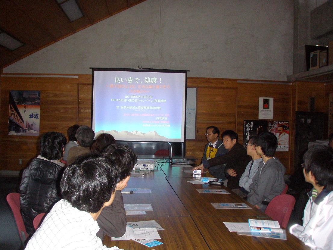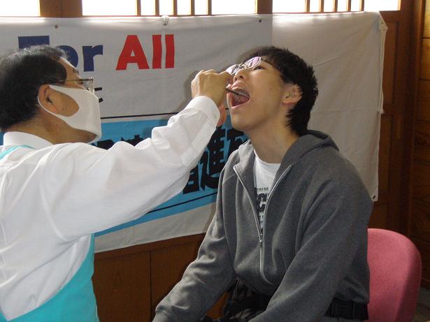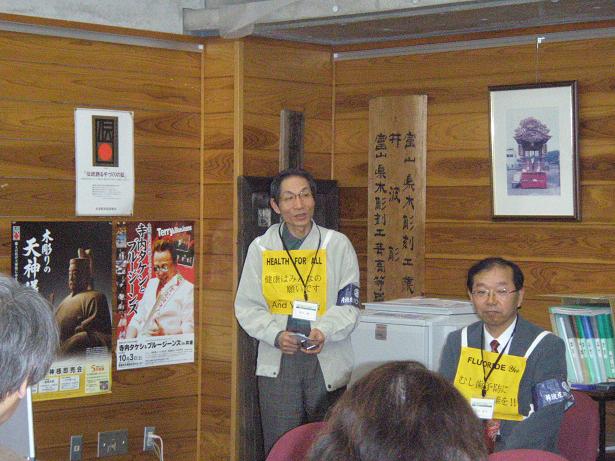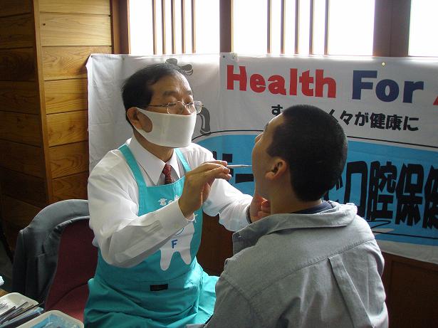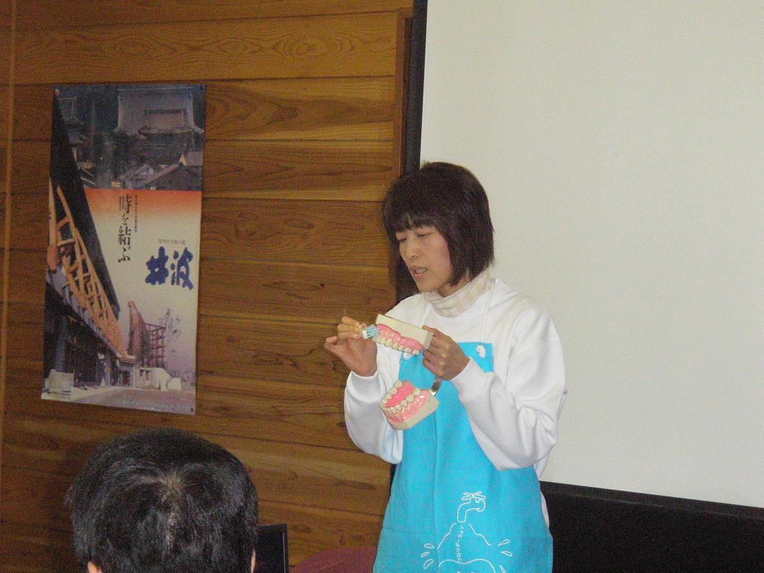 そのご縁で、井波庄川ロータリークラブと富山むし歯予防フッ素推進市民ネットワークは、今回、訓練校に通われる生徒さんに、お口の健康に関心を寄せてもらおうと、歯科健診と歯科衛生士による歯磨き指導、歯科医師の山本武夫代表による健康講話「よい歯で健康―獅子頭のような、丈夫な歯と歯ぐきで、ノミを持とう!」がおこなわれました。山本代表の話は、8020運動、むし歯予防には、フッ素を、歯周病予防には、定期健診と歯石除去、正しい歯ぐき磨きという内容でした。