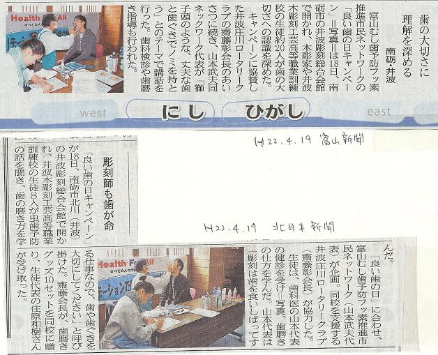 富山むし歯予防フッ素推進市民ネットワーク【And You (あゆ) の会:代表 山本武夫】は、井波庄川ロータリークラブ【会長:斉藤彰】の協賛で、4月18日に、上記キャンペーンを開催しました。この日は、語呂合わせで、「よい歯の日」として、日本歯科医師会はじめ各種団体が啓蒙活動を行っているところです。当ネットワークも、2001年発会以来、いい歯の日(11月8日)などに、過去18回キャンペーン活動を行ってきましたが、今回19回目になり、井波庄川ロータリークラブの協賛を得て、井波木彫刻工芸高等訓練校の生徒さんを対象に、健康教室を開きました。