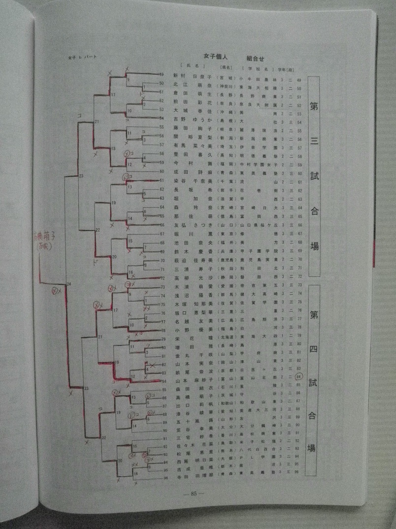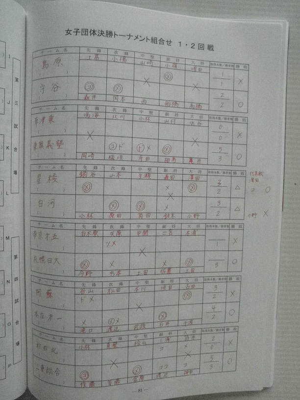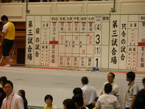 | 今年のインターハイは、井波中出身者は、女子の山田千菜都選手(先鋒)・山本麻紗子選手(次鋒)の富山北部コンビが出場しました。 団体で、5年連続出場の富山北部女子は、予選リーグで、阿蘇(九州大会1位:熊本、2年生チーム)と日吉ケ丘(京都の強豪)というブロックに入って、苦しい戦いを強いられました。結局、予選3位で、決勝トーナメントへ進出できず、来年に期待したいものです。個人では、山本麻紗子選手が、初戦の畝尾奈波選手(日吉ケ丘:大将)を延長で破って、3回戦では、栄花瞳選手(北海道:東海大四、一年:有名な剣道日本一【2000年】・栄花直輝七段を父に持つ)を破って四回戦まで進出。隣の試合場では、高校の先輩・藤村選手も快調に一回戦から勝ち進み,四回戦に進出しました。最終日の準々決勝進出をかけての四回戦では、藤村選手・山本選手ともに敗れはしましたが、富山県勢女子として、初めてベスト16に2人が進んで、応援席は大変な盛り上がりでした。 ![]() 初戦の日吉ケ丘戦、惜敗。(阿蘇ー日吉ケ丘は引分なので、予選敗退決定) 2戦目は、予選勝ちあがりをかけて、必死の阿蘇の前に、完敗。 |