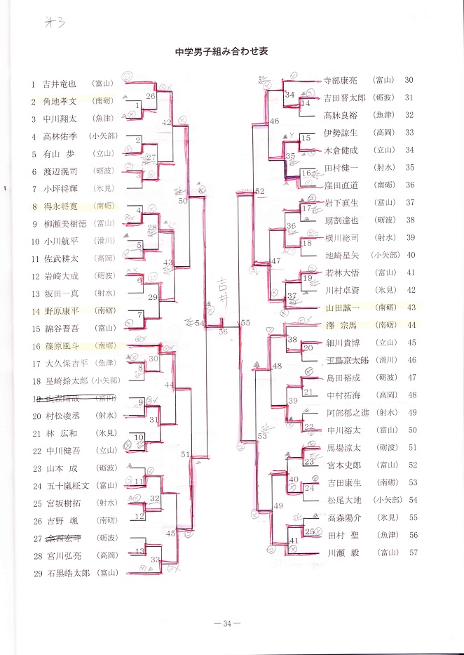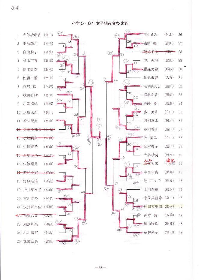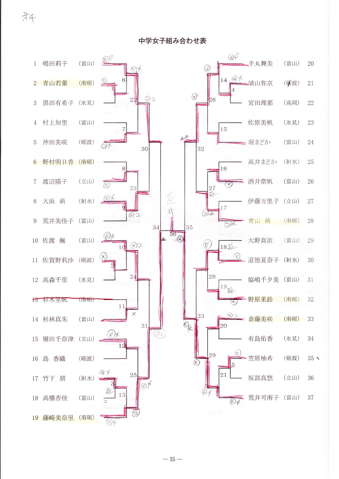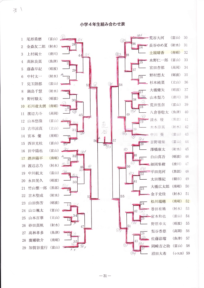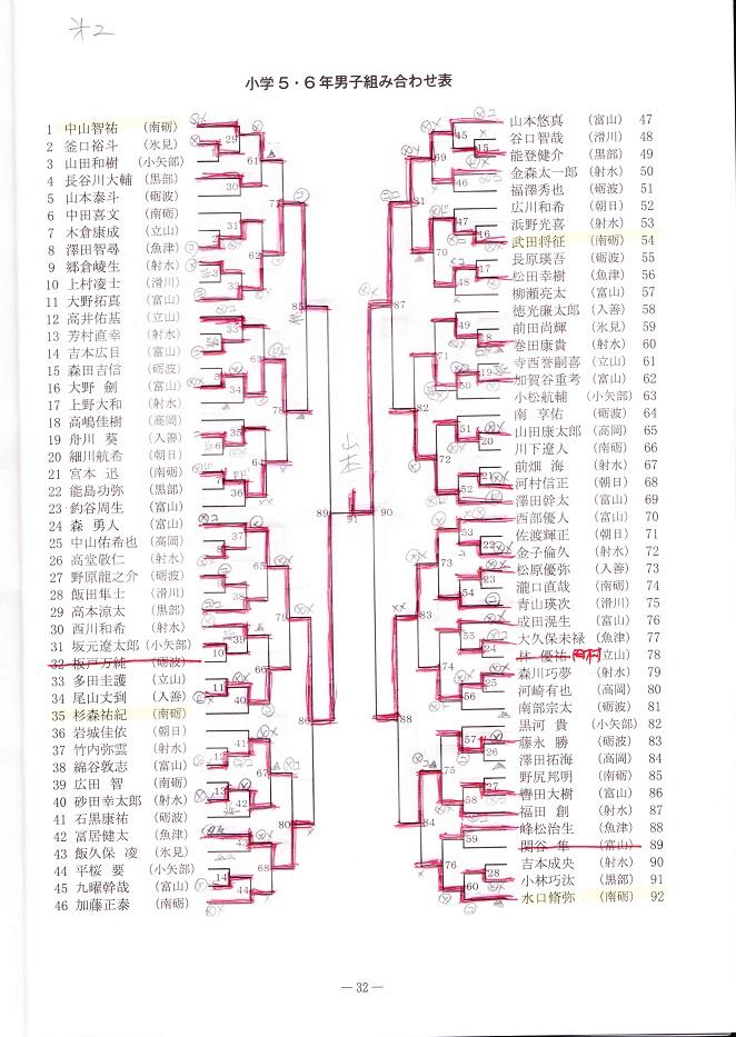| 井波剣道スポーツ少年団の成績 *小4の部 石川凌太朗 3回戦進出(2勝:ベスト16) 土屋晴香・松川瑞穂 1回戦敗退 *小5−6男子の部 武田将征 4回戦進出(3勝:ベスト16) 中山智宏・水口脩弥 4回戦進出(2勝:ベスト16)、 杉森佑紀 2回戦敗退 *小5−6女子の部 神田万里奈 3回戦進出(2勝:ベスト16) *中男子の部 山田誠一 3位入賞(3勝) 澤宗馬・篠原風斗 ベスト8(2勝) 角地隆文・得永将寛 1回戦敗退 *中女子の部 藤崎美奈里 次勝(4勝) 青山萌 ベスト8(勝) 斉藤美咲・野原果鈴 3回戦進出(ベスト16:1勝) 青山若葉 2回戦進出(1勝) 野村明日香 2回戦敗退 |