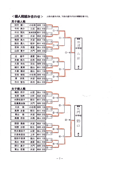 | 今年の県新人選は、砺波地区を団体個人の男女とも無難に勝ちあがっての大会でした。どこまで力が発揮できるか楽しみでした。 その結果は、見事3年ぶりの男女アベック優勝でした。男子は予選リーグ2位からの優勝、女子は結果的には危なげなく優勝でした。 個人戦は、男子は、山田誠一が嬉しい公式戦初優勝を、県新人選で勝ち取りました。スポ少3位が今まで最高だっただけに、これからの活躍に期待したい。篠原風斗、澤宗馬は、ともに1回戦で不覚をとった。全国大会につながらないとはいえ、確実に勝ちあがる力を来年までに備えて全中を勝ち取ってほしい。女子は、藤崎美奈里が抜けた後、青山姉妹がどこまで上にいけるかだったが、嶋田莉子・野口真子の壁に跳ね返された。来年はこの壁を破って、全中目指し頑張ってほしい。・・・(山本武夫) (参考) 男子団体 @井波 A小杉南 B速星・芝園 女子団体 @井波 A小杉南 B山室・大門 男子個人 @山田誠一(井波) A木倉健成(雄山) B若林大悟(速星) 辻晶平(速星) 女子個人 @野口真子(大門) A嶋田莉子(山室) B明野沙耶(射北) 青山萌(井波) |