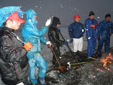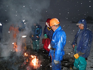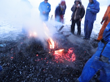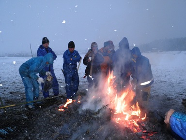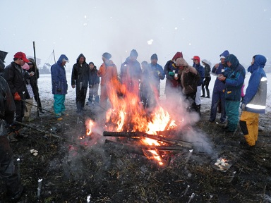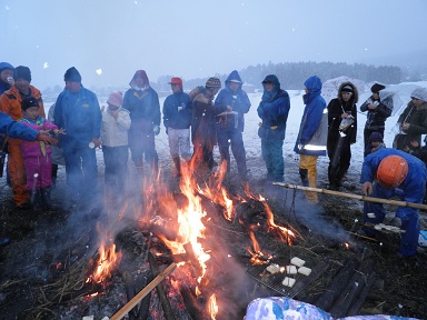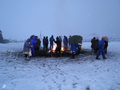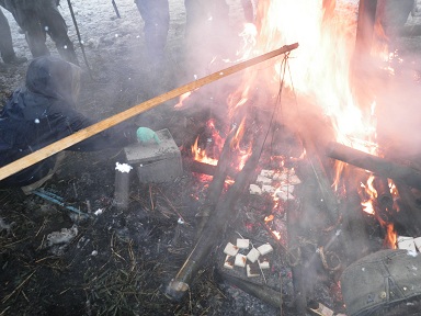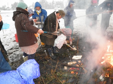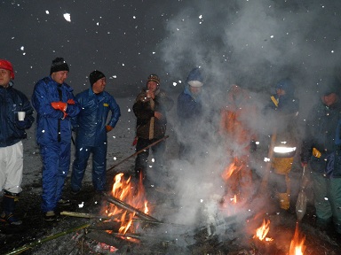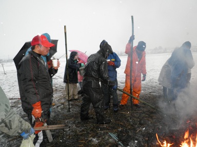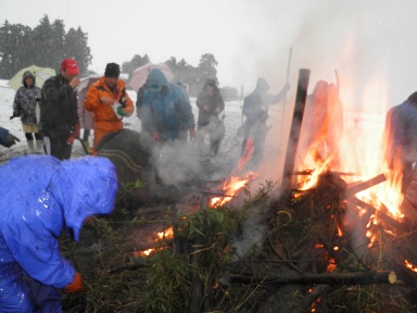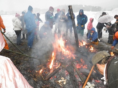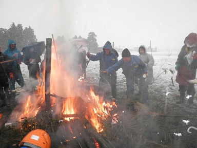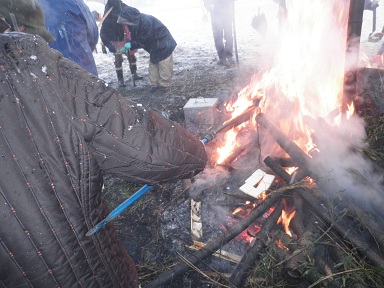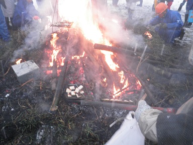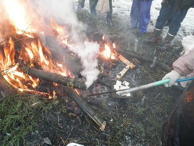 ![]() 竹竿につけた、書き初めを燃やします。高く上がれー! |