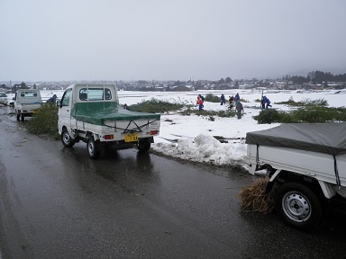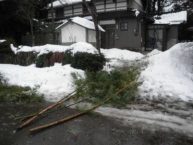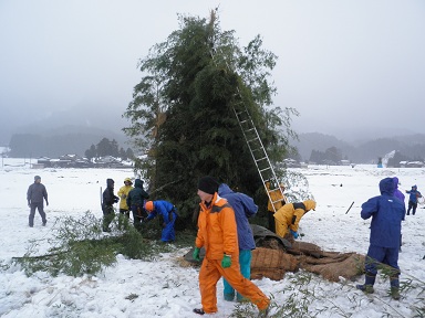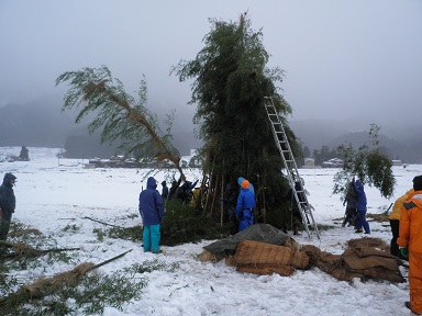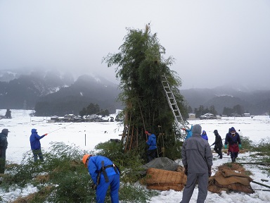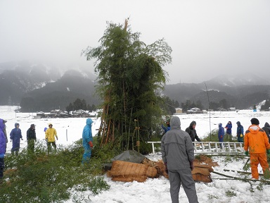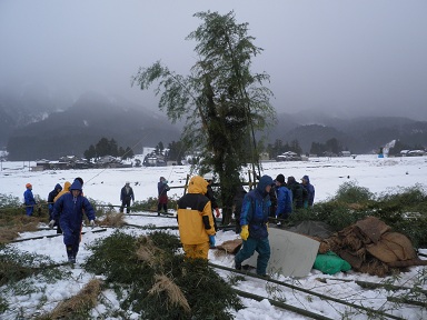 | 古くから、谷部落(町内)で、厄払いや無病息災を祈って、竹やわらなどを持ちより、燃やして左義長をしていました。 この地域では、昔は左義長とは言わず、『としとき』や『どんどやき』と言っていました。 お正月のしめ飾りや古い神棚のお札をその時に燃やし、子どもたちの書き初めの紙は、左義長の火に焼かれ、勢いよく上がると上手に書いたとか、よく勉強が出来るとほめられたものでした。 また、この竹がよく燃えた後の、『おき』(よく焼けて真っ赤な状態の時)を頼りに、それぞれの家から持ってきた餅をあぶって、食べました。特に、竹の黒い灰がついたのを食べると、元気でその年は風邪をひかず健康だと言われました。この『どんどやき』に家にいて来れない家族のために、半分ほどしか焼かずに、竹の灰を付けて、帰って食べさせてもいいといことで、『灰ころがし』した餅を持って帰ることもしました。また、焼け焦げた竹のまだしっかりした部分を細く削って、箸にして食べるとその年健康だとも、昔の人は言っておられました。(現代の素人健康法に、竹炭があります。消臭効果は抜群で、酸を中和する働きなどもあり、こういったものが古くから、このどんどやきの竹の灰ころがしに由来するのかもしれません) 小さいころ、年寄りの人たちは、子供に「よく、火にあたっていこ。小便たれんようになるぞ。」とも、言っておられ、心当たりのある子供はわざと火の近くに行ったりしたものでした。(小生もその一人:昔のように暖房の少ない時代は、このような大きな火は貴重な暖房の一種だったでしょう。どんどやきから、家に帰っても手足は冷たくても、顔が真っ赤で、いつまでもほてっていました。) この地域では、各部落ごとに、行うため、古くから、「あの在所、もう火をつけたぞ。おらちゃもそろそろつけるか。」と、遠目に夜も更けかけたころ、あちこちに見えてくる左義長の灯りが気になったものでした。 休日法がかわり、「成人の日」が1月15日でなくなってから、このどんどやきの日が定まらなくなってきました。昔は、必ずこの行事は、1月14日の夜と決まっていました。なぜなら、翌日が祝日だからで、少しぐらい遅く火をつけても、翌日は休みですから・・・ そして、この14日というのは、昔から大雪が降るのが多く、翌日の成人の日が快晴ということが多かったような気がします。 組み立てるのは、昔から、児童クラブ(児童会)の父兄が中心でしたが、子供たちの減少で、青年会が必然的に加わり、そのうち町内会の行事として行われるようになってきました。近くに戸板団地があり、何年か前から、一緒に行事を行うようになって来ています。 昔の多雪時代(積雪1m50前後)には、雪の中に立てるだけでも竹が倒れないようなこともありましたが、最近の温暖化で、雪のない年のどんどやきもありました。 そういう年には、よく消防車の見回りが回って行き、風向きも、人家に灰が行かないか、気になりました。やはり、どんどやきは雪が無いといけませんね。むかしは、翌日その灰がどこまで飛んだか、気にしたものでした。 谷のどんどやきも、昔から、組み立てる場所が、いくつかあって、その年によって変わったことがありました。しかし、1度やった場所は、10何年続くことが多かったです。小生のやがて60年の記憶では、谷の宮様の下の畑というのが一番古く、それから、中島【谷は、古くから3つの班があった。ひがしだん(東谷の略?)、なかじま(中島?)、にしだん(西谷?)】の山本家の東側の田んぼ、それから、東谷の武田本家の東よりの田んぼ、続いて、西谷の前田家の東よりの田んぼ【ここは、院瀬見往来を挟んで、下手の時と上手の時があった】、それから、ここ近年は、東谷の武田本家のずっと東よりの田んぼです。 今年は、谷の在所に生まれて、久しぶりにこのどんどやきの最初から最後まで、参加できたので、一度この行事を記録したくて、写真もたくさん撮りました。昔はどの家にも、竹藪があり、少しづつ竹を集めて、その場所まで運んだものでした。今は、谷の部落にも、竹藪がある家が、亀田家とお寺(浄教寺)と我が家(実際には我が家に近接する、武田家・前田家にも延びた竹が出ます)しかなく、そこから集めるので、年によってはあまり集まらず小さなどんどやきになったこともありました。今年は、我が家も、クマ出没したりするので、藪を整理するつもりで、たくさん切って出しました。そしたら、亀田家や浄教寺からも多めに集まったようで、大きなかたまりになりました。 今年は、天候的は恵まれず最悪のコンディションでした。前日は快晴、このページを作成している翌日の今日(10日)も天気は良く、1日ずれて欲しかったです。昨日は、夜中からの雨がずっと日中も降り続き、切り出した竹はびしょびしょ。火種になる藁なども、組み立てていくうちに段々湿って行きました。午後1時から組み立て始め、2時半前に完成し、3時には点火しました