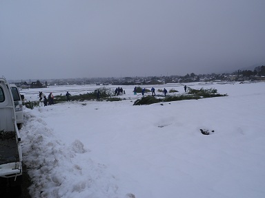![]() 周囲に、偏った時の杭を打って、縄を止めます。 今年は、あまり風もなく、杭はほとんど必要なし。 |