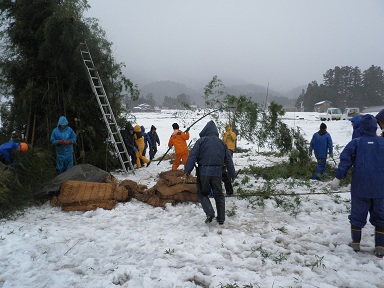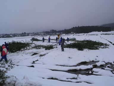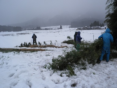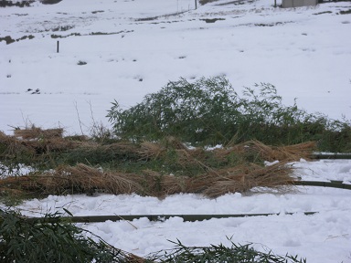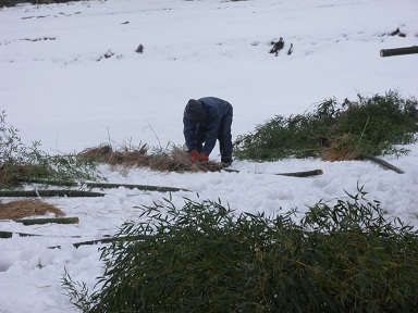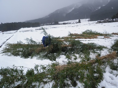 ![]() 竹に藁を付けます。(今年は雨で、効果少なし) |