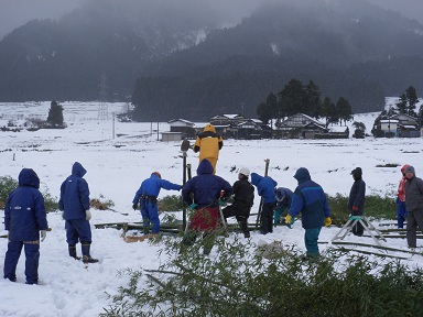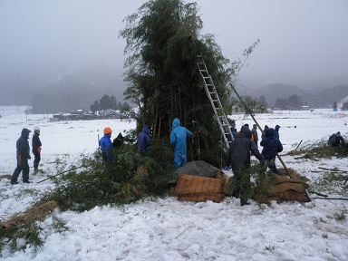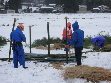 ![]() 最後の竹を立て、周りを縄でぐるぐる締めます。 |