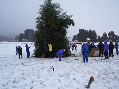 ![]() 2本つけた縄を支える人と、倒れないように持つ人と… |