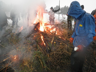 ![]() ひとしきり、乾いた竹が燃え尽きるとまた、下火に… |