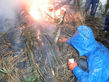 ![]() 湿っているので、なかなか燃え上がりません。 |