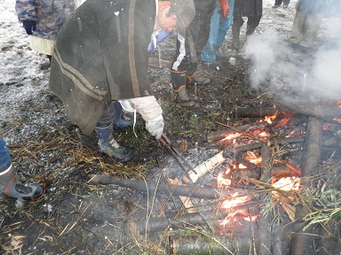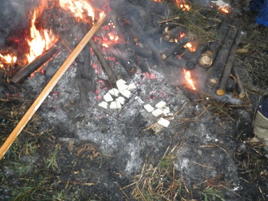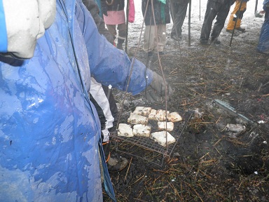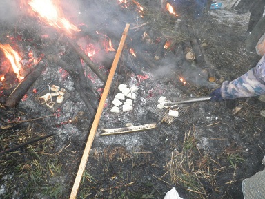 ![]() 昔は、みなこうして餅を焼きました。(半分の竹に乗せ…) |