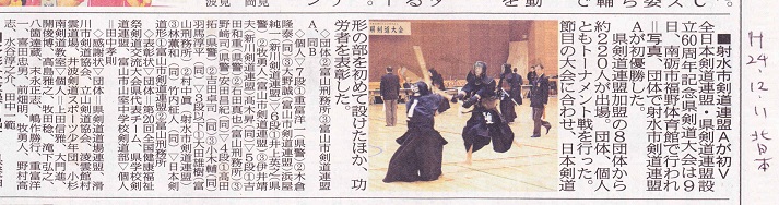 ・競技 個人 4段の部 高田拓(県警) 優勝 ・表彰(感謝状) *団体 全日本剣道連盟表彰・県剣道連盟表彰 ・・・井波剣道スポーツ少年団 *個人 日本スポーツ少年団創立50周年記念表彰 ・・・高田毅、篠原正之、山田修弘