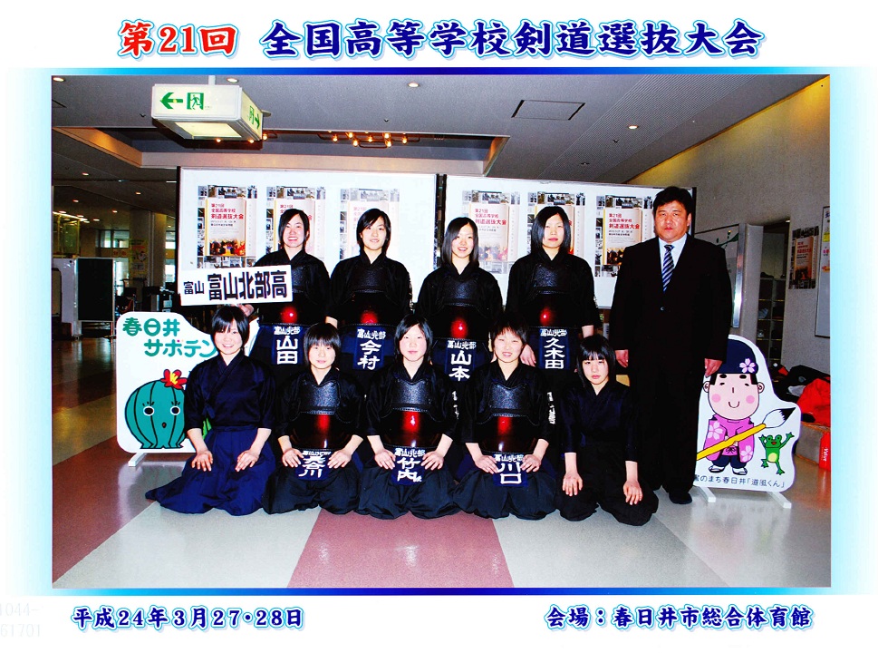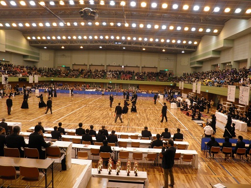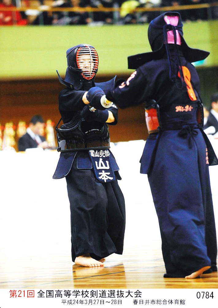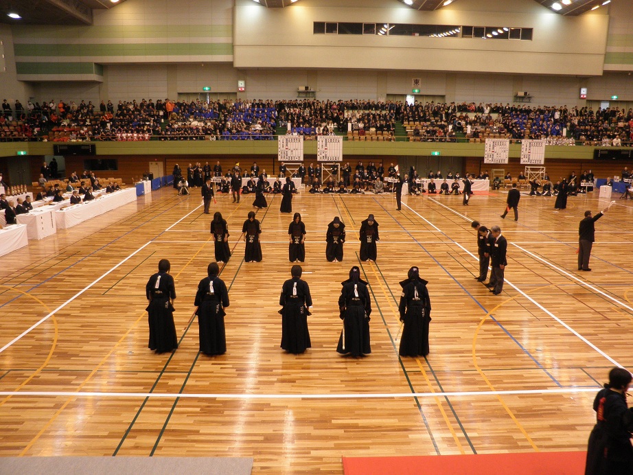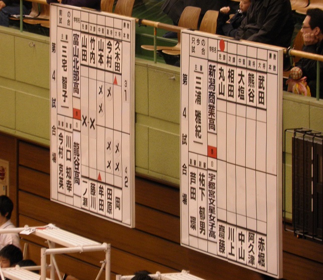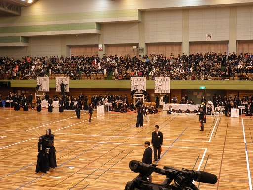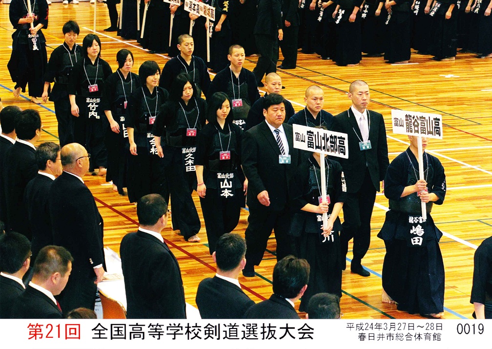 | 昨年は、東日本大震災で中止となって、2年ぶりの選抜大会の開催でした。初めて選抜大会を観戦しました。 小生は、韓国への研修があり、初日の朝11時に、中部国際空港に到着、富山北部の試合進行が気になりながら、名鉄特急に乗りました。1試合目の結果は電車の中で聞き、歓声をあげました。金山駅で、JRに乗り換え、春日井駅に向かいました。途中で、春日井駅の手前に、勝川(かちがわ:勝ち側?)駅がある事がわかり、春日井駅を降りてから、勝川駅行きの切符を、験担ぎに買いました。タクシーで、20分余りで、会場の春日井市総合体育館に到着、富山北部の2試合目以降を観戦しました。 富山県勢は、男子が龍谷富山(試合結果)が出場し惜しくも予選リーグ敗退、女子は富山北部(試合結果)が出場し、見事予選突破を果たしました。 女子は、富山北部が予選リーグ初戦で、高松商(香川県)と対戦、先鋒山田選手が面1本勝ちして、幸先よいスタート、次鋒竹内選手は、惜しくも引き分けで試合を繋ぎ、中堅山本選手は堅実に面1本勝ちし、有利に試合を運び、副将今村選手が小手1本先行して、勝負を決めたかに見えましたが、終盤面を返され、ドキッとしたが、すぐ後に面を決めて、富山北部の勝ちが決まりました。大将戦は、久木田選手が、面を先行されるも、落ち着いて面を返し、引き分けに持ち込み、結果は3-0と圧勝でした。続くリーグ2戦目は、富山北部対流山(千葉県)で、先鋒山田選手は、面1本先行するも、その後面を返され、その後の技が旗が1本づつで優位に進めるも引き分けに終わり、次鋒の竹内選手は、これまた優位に進めるも終盤に逆に面を取られ、相手に先行されました。中堅山本選手は、慎重に技を出すも旗が重く、中盤面を決めるも、そのまま時間が切れ、ここまで全くの互角となりました。副将戦は、流山が上段の選手に対し、今村選手は全く上段を苦にしないタイプで、面を先行し、このまま終わるかと思いきや、相手にタイミングだけの小手を決められ、嫌なムードになりかけましたが、その後、すぐさま、突きを放つと見事に決まり、ここで、一歩リードしました。大将戦は、久木田選手が序盤で面を決めて、このまま逃げ切れるか不安でしたが、引き分けでも勝ちだけに、慎重に試合を運ぼうとした一瞬、面を返されました。しかし、これまた、間もなく面を決めた久木田選手の勝利で、富山北部は3−1で勝利を収め、嬉しい決勝トーナメント出場を勝ち取りました。隣を見ると、1−0の試合がいくつもある中、応援席はガチンコ対決でハラハラしながらも面白い試合でした。2日目の決勝トーナメントは、富山北部は1回戦で、龍谷(佐賀県)と対戦しました。先鋒山田選手は、技を出して攻めるも、旗が重く、1本だけしか上がらない場面が2度あり、結局悔しい引き分けに、次鋒の竹内選手は、慎重に戦いを進め、相手に打たせる場面を作らせず、引き分けて中堅に繋ぎました。中堅の山本選手は、序盤は攻めきれず、中盤に相手に鍔競り合いの反則が出て、その後まもなく出てきた所を面を続けざまに2本決めて、富山北部がリードしました。副将今村選手は、中盤に面を先行されるも、落ち着いて面を返し、このまま終わるかと思われた瞬間、面を決められました。大将戦を前に本数では一歩リードで、久木田選手は引き分けでもチームは勝てる条件で試合が始まりました。相手大将も勝つしかないので、前へ前へと突き進んできました。中盤、久木田選手の間合いが切れた時、面を決められ、その後、返そうと出た所をまた、面を決められ、富山北部は1回戦で敗退となりました。1本しか上がらない旗が、こちら側ばかりにあったので、もしも、そのうち1本でも決まっていたら、勝敗が逆になっていただろうという惜しいし、悔しい結果でした。ベスト16という事になりましたが、選手たちは良く頑張りました。 また、帰りの車中で、山本麻紗子選手が、優秀選手に選ばれたという嬉しいニュースが入ってきました。富山県勢としては男女を通じて、初めてということだそうです。個人戦ではないので、団体戦で決勝トーナメントへ行けなければもらえなかった賞という意味では、全員でもらった賞ともいえます。これを励みに、また県勢剣士で続く事を期待します。(山本武夫) |