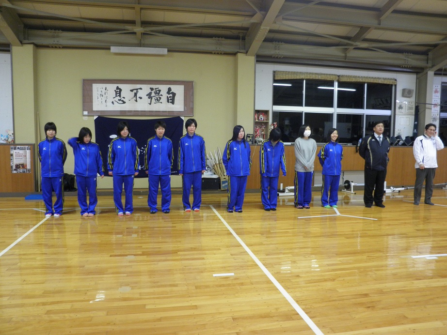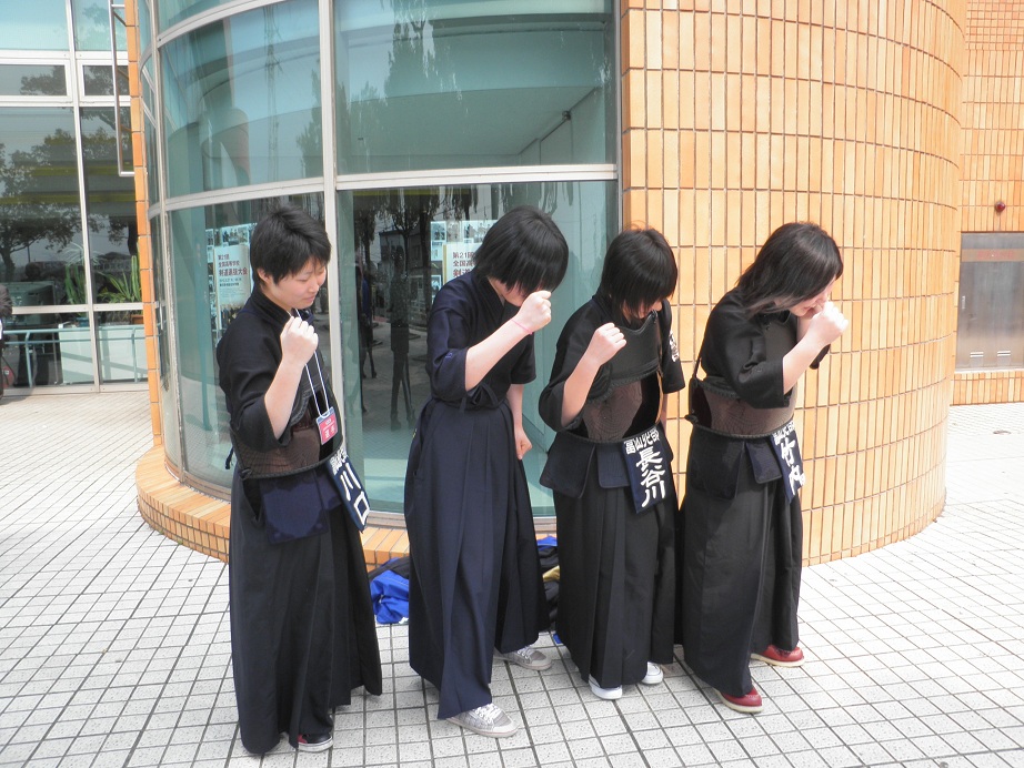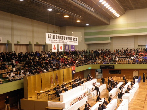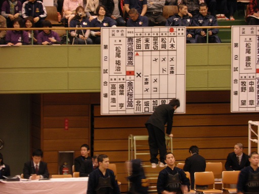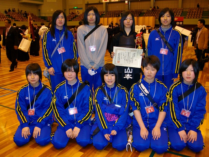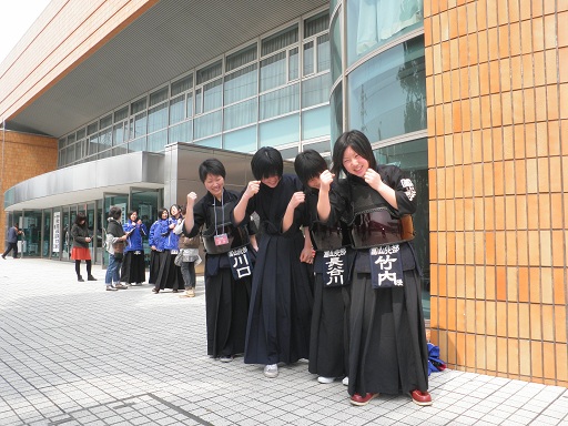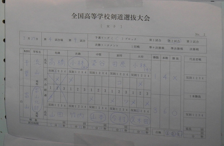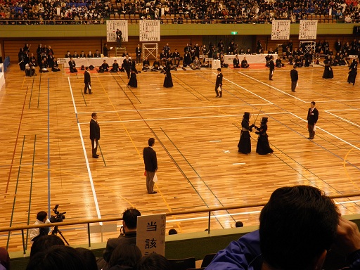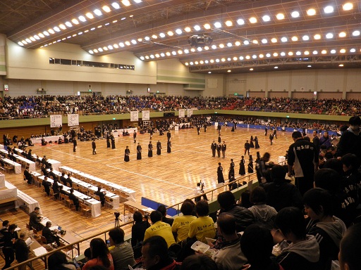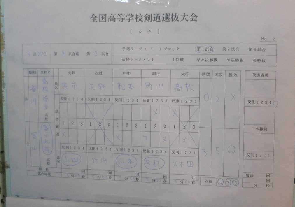 | 昨年は、東日本大震災で中止となって、2年ぶりの選抜大会の開催でした。初めて選抜大会を観戦しました。 小生は、韓国への研修があり、初日の朝11時に、中部国際空港に到着、富山北部の試合進行が気になりながら、名鉄特急に乗りました。1試合目の結果は電車の中で聞き、歓声をあげました。金山駅で、JRに乗り換え、春日井駅に向かいました。途中で、春日井駅の手前に、勝川(かちがわ:勝ち側?)駅がある事がわかり、春日井駅を降りてから、勝川駅行きの切符を、験担ぎに買いました。タクシーで、20分余りで、会場の春日井市総合体育館に到着、富山北部の2試合目以降を観戦しました。 富山県勢は、男子が龍谷富山(試合結果)が出場し惜しくも予選リーグ敗退、女子は富山北部(試合結果)が出場し、見事予選突破を果たしました。 女子は、富山北部が予選リーグ初戦で、高松商(香川県)と対戦、先鋒山田選手が面1本勝ちして、幸先よいスタート、次鋒竹内選手は、惜しくも引き分けで試合を繋ぎ、中堅山本選手は堅実に面1本勝ちし、有利に試合を運び、副将今村選手が小手1本先行して、勝負を決めたかに見えましたが、終盤面を返され、ドキッとしたが、すぐ後に面を決めて、富山北部の勝ちが決まりました。大将戦は、久木田選手が、面を先行されるも、落ち着いて面を返し、引き分けに持ち込み、結果は3-0と圧勝でした。続くリーグ2戦目は、富山北部対流山(千葉県)で、先鋒山田選手は、面1本先行するも、その後面を返され、その後の技が旗が1本づつで優位に進めるも引き分けに終わり、次鋒の竹内選手は、これまた優位に進めるも終盤に逆に面を取られ、相手に先行されました。中堅山本選手は、慎重に技を出すも旗が重く、中盤面を決めるも、そのまま時間が切れ、ここまで全くの互角となりました。副将戦は、流山が上段の選手に対し、今村選手は全く上段を苦にしないタイプで、面を先行し、このまま終わるかと思いきや、相手にタイミングだけの小手を決められ、嫌なムードになりかけましたが、その後、すぐさま、突きを放つと見事に決まり、ここで、一歩リードしました。大将戦は、久木田選手が序盤で面を決めて、このまま逃げ切れるか不安でしたが、引き分けでも勝ちだけに、慎重に試合を運ぼうとした一瞬、面を返されました。しかし、これまた、間もなく面を決めた久木田選手の勝利で、富山北部は3−1で勝利を収め、嬉しい決勝トーナメント出場を勝ち取りました。隣を見ると、1−0の試合がいくつもある中、応援席はガチンコ対決でハラハラしながらも面白い試合でした。2日目の決勝トーナメントは、富山北部は1回戦で、龍谷(佐賀県)と対戦しました。先鋒山田選手は、技を出して攻めるも、旗が重く、1本だけしか上がらない場面が2度あり、結局悔しい引き分けに、次鋒の竹内選手は、慎重に戦いを進め、相手に打たせる場面を作らせず、引き分けて中堅に繋ぎました。中堅の山本選手は、序盤は攻めきれず、中盤に相手に鍔競り合いの反則が出て、その後まもなく出てきた所を面を続けざまに2本決めて、富山北部がリードしました。副将今村選手は、中盤に面を先行されるも、落ち着いて面を返し、このまま終わるかと思われた瞬間、面を決められました。大将戦を前に本数では一歩リードで、久木田選手は引き分けでもチームは勝てる条件で試合が始まりました。相手大将も勝つしかないので、前へ前へと突き進んできました。中盤、久木田選手の間合いが切れた時、面を決められ、その後、返そうと出た所をまた、面を決められ、富山北部は1回戦で敗退となりました。1本しか上がらない旗が、こちら側ばかりにあったので、もしも、そのうち1本でも決まっていたら、勝敗が逆になっていただろうという惜しいし、悔しい結果でした。ベスト16という事になりましたが、選手たちは良く頑張りました。 また、帰りの車中で、山本麻紗子選手が、優秀選手に選ばれたという嬉しいニュースが入ってきました。富山県勢としては男女を通じて、初めてということだそうです。個人戦ではないので、団体戦で決勝トーナメントへ行けなければもらえなかった賞という意味では、全員でもらった賞ともいえます。これを励みに、また県勢剣士で続く事を期待します。(山本武夫) |