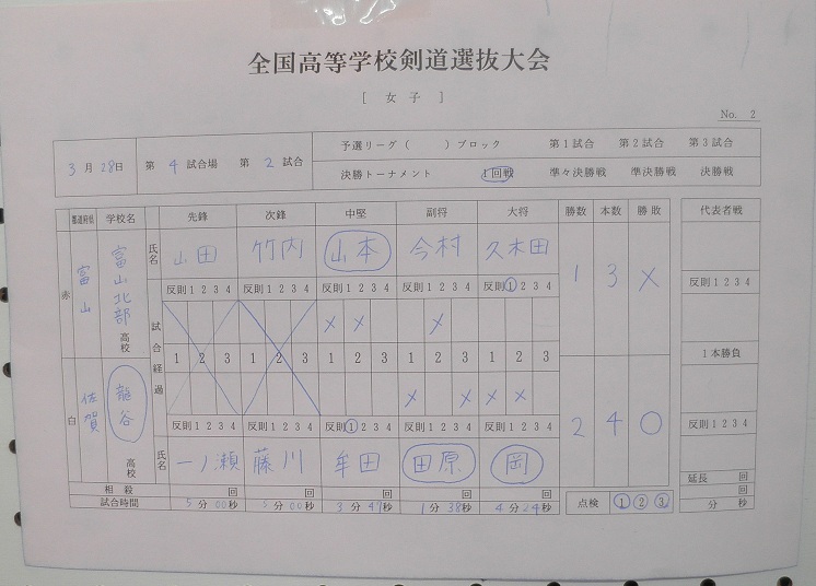 富山北部高校女子剣道部の成績:決勝トーナメント進出(ベスト16)