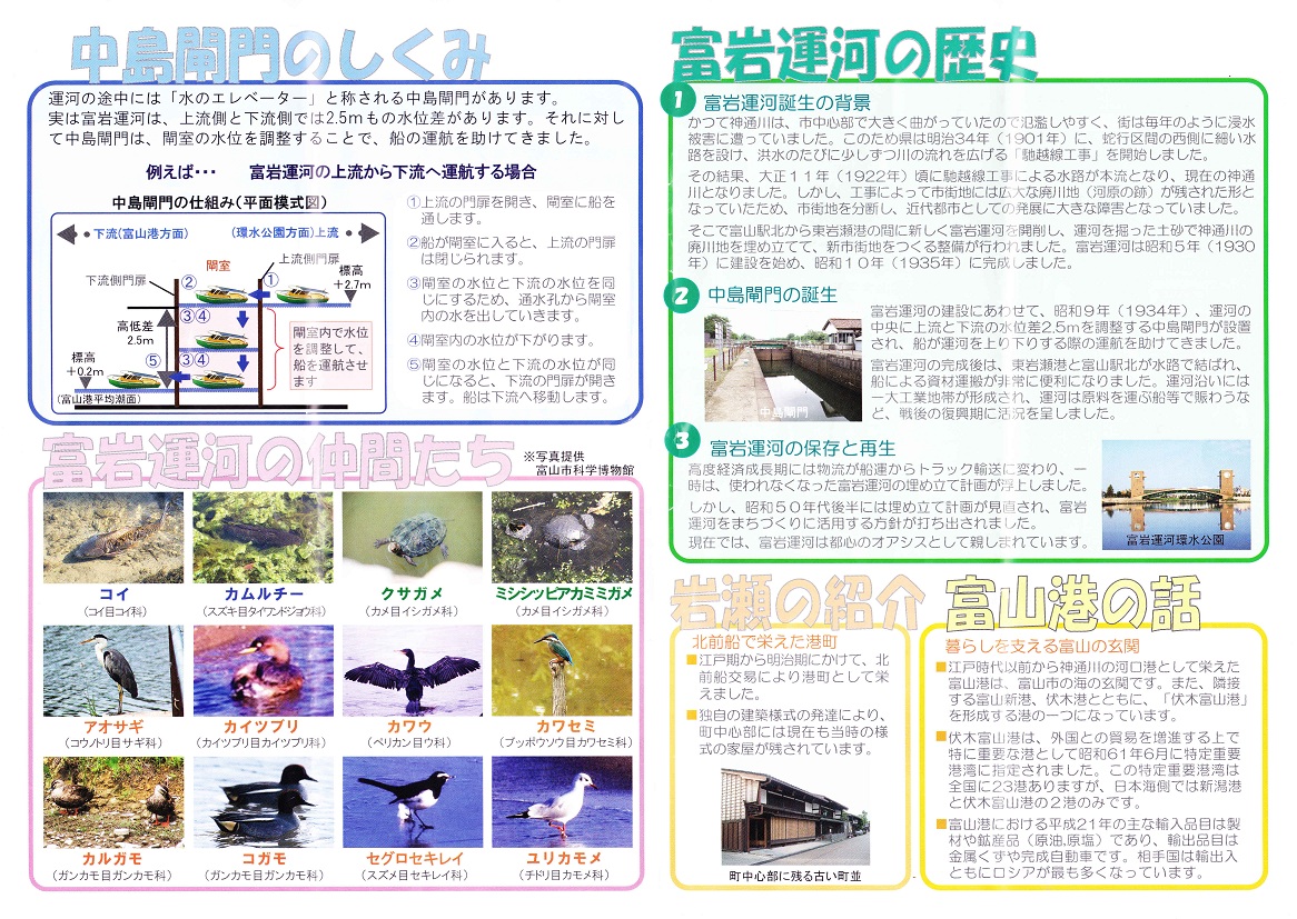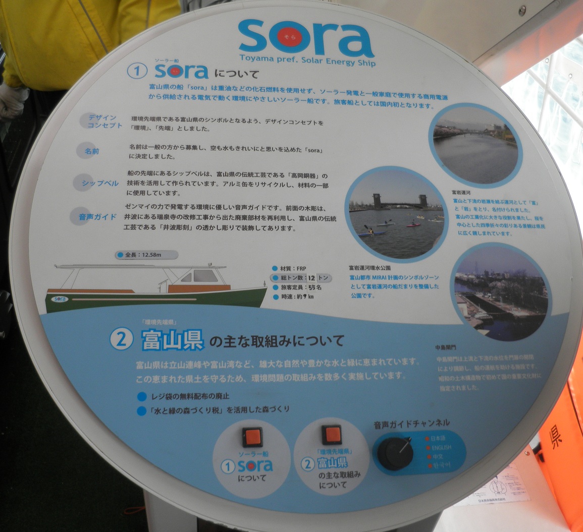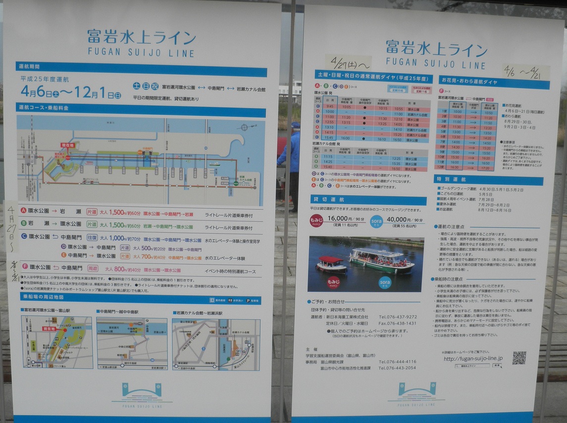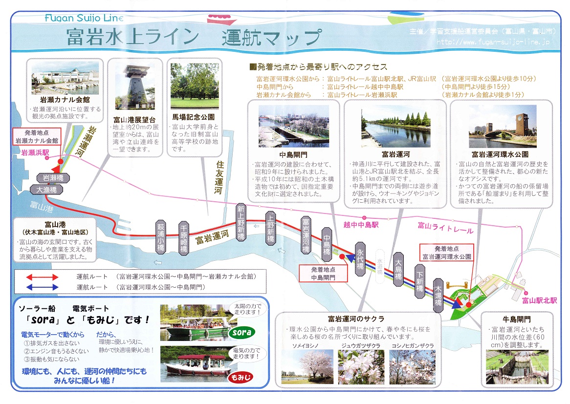2.富岩水上ライン:富山駅北都心のオアシス「富岩運河環水公園」から、国指定重要文化財「中島閘門(こうもん)」や北前船で栄えた港町「岩瀬」まで約5.1kmを、ソーラー船「sora」と電気ボート「もみじ」が案内します。運行期間は、4月6日から12月1日まで。今回は、中島閘門まで、お花見遊覧の特別運航で、21日まで平日も。