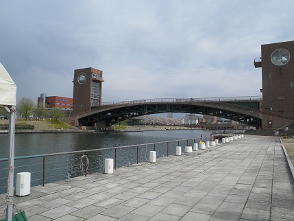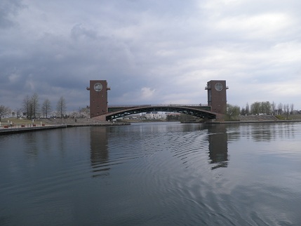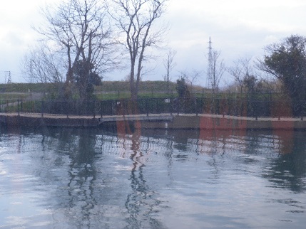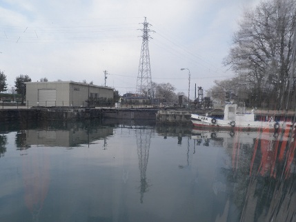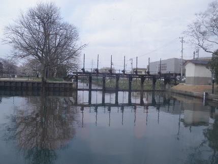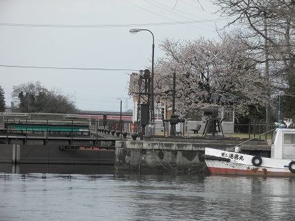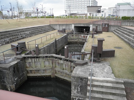 3.中島閘門(なかしまこうもん):運河の途中には「水のエレベーター」とよばれる中島閘門があります。上流と下流の水位差2.5mを調節するパナマ運河式閘門で、現在は国内ではここだけです。昭和9年に設置され、平成10年には昭和の土木構造物としては初めて、国指定重要文化財に選定されました。