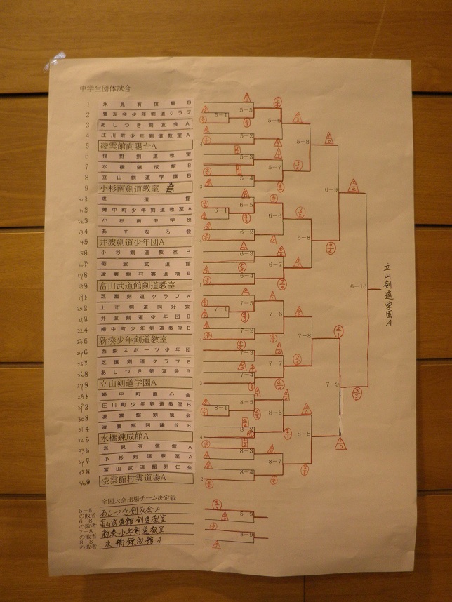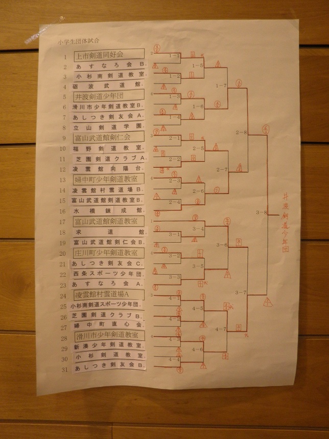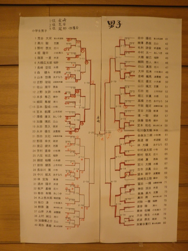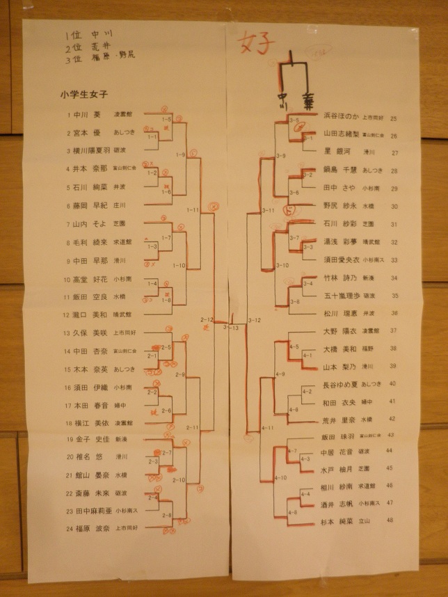| *井波スポ少の成績 団体 小学生(神田涼・篠原・松川・幸山・石川) 7年ぶり2度目の優勝・・・日本武道館出場 中学生A(水口・中山・青山若・武田・青山萌) 3回戦敗退(ベスト16) B(松田・神田万・杉森【嶋】・池澤・山本) 1回戦敗退 個人 小学生男子 酒井陽平 4回戦進出(2勝:ベスト16)、篠原一星 3回戦進出(1勝)、神田涼太 2回戦進出(1勝)、石川凌太朗 2回戦敗退 小学生女子 松川瑞恵 2回戦敗退、石川絢菜 1回戦敗退 中学生男子 松田和幸・池澤恭輔 2回戦敗退、中山智佑・山本輝 1回戦敗退 中学生女子 青山萌・青山若葉 3位(3勝)、神田万里奈 2回戦進出(1勝)、吉田いずみ 1回戦敗退 |