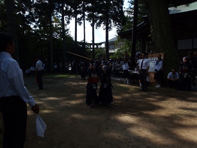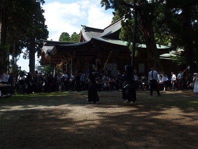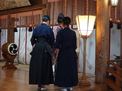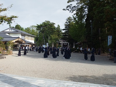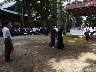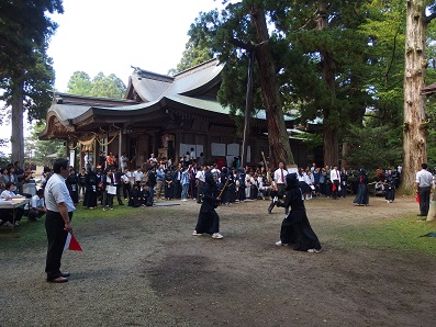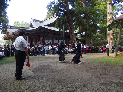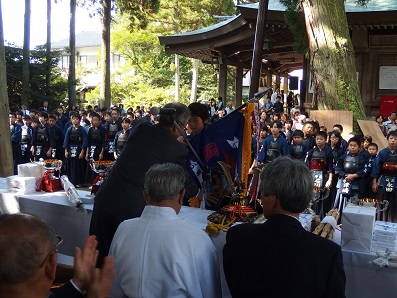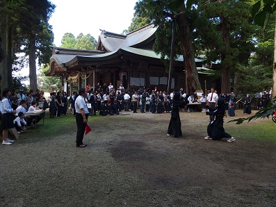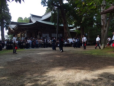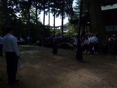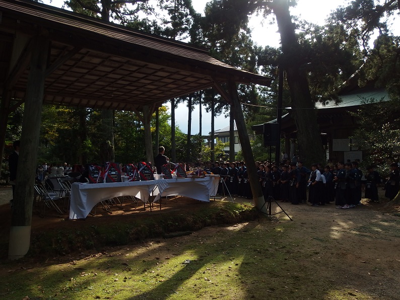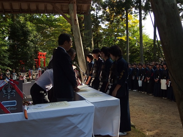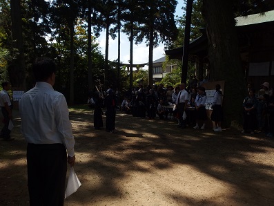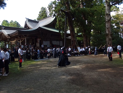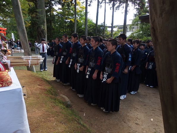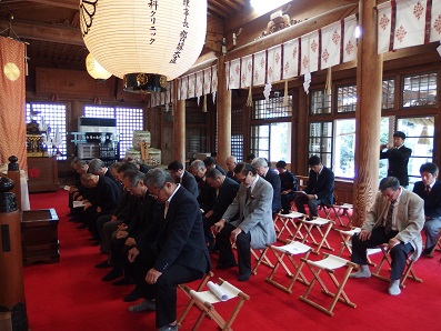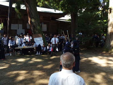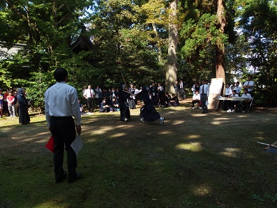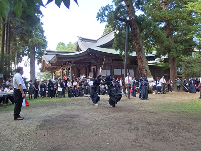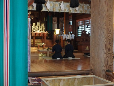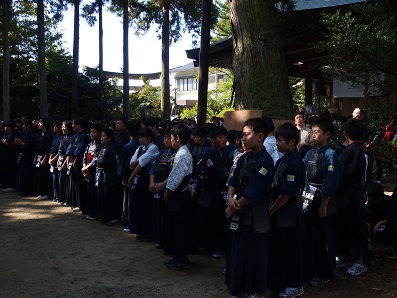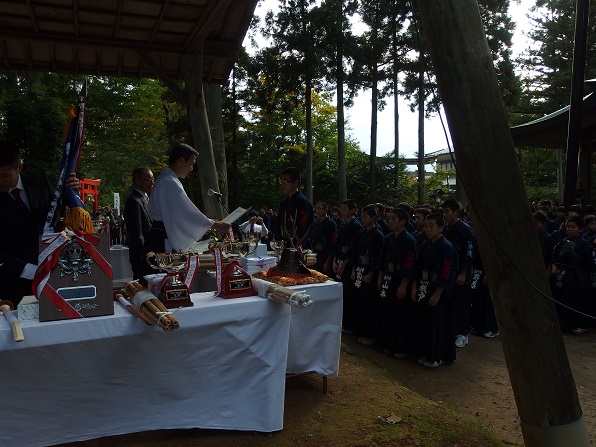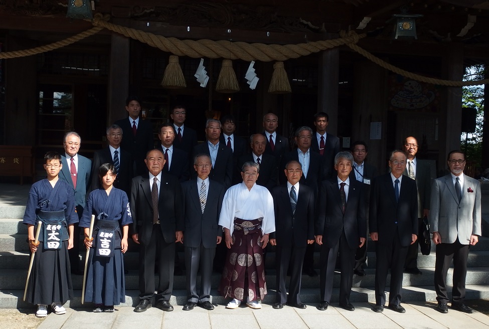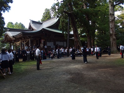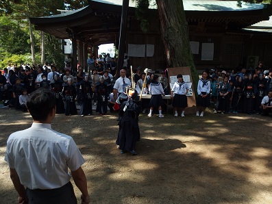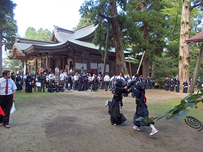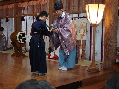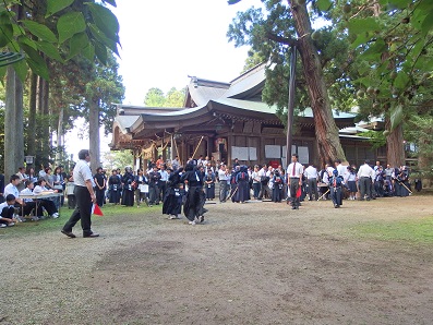 ![]() 高瀬神社神前にて、剣道大会の報告祭 |